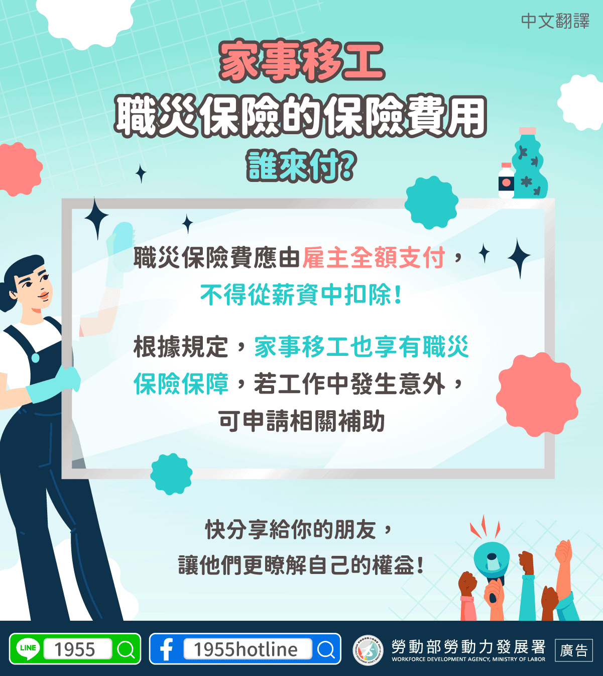 外籍看護|家事移工職災保險的保險費用誰來付(保險)-多國語 2025-06-17 作者: 21世紀人力仲介 媒體布小編 21世紀全球外勞集團協助您找到最適合的優質外籍勞工/家庭看護工/家庭幫傭 / 製造業移工/營造業移工/農業移工,如有服務需求請來電免付費專線(手機市話皆可撥) 0800-32-1111 或 留言給我們 上一頁上一篇2025外勞廢聘轉出 雇主轉換與承接移工規定懶人包 下一篇外籍看護|家庭看護工虐老案例頻傳 雇主籲正視 促家事移工強制納勞保 移團陳情下一篇 農業移工|失聯移工自組工班 侵害農民權益 立委籲充沛合法人力 農業部將爭取 2025-10-22 閱讀更多 » 外籍移工|巨大集團宣布擴大零招聘費範圍 規劃補償在職移工過去支付費用 2025-10-22 閱讀更多 » 僑外生|產業輔導團升級 七大措施強化韌性 包含勞動力升級 14 萬家企業將受惠 2025-10-27 閱讀更多 » 相關