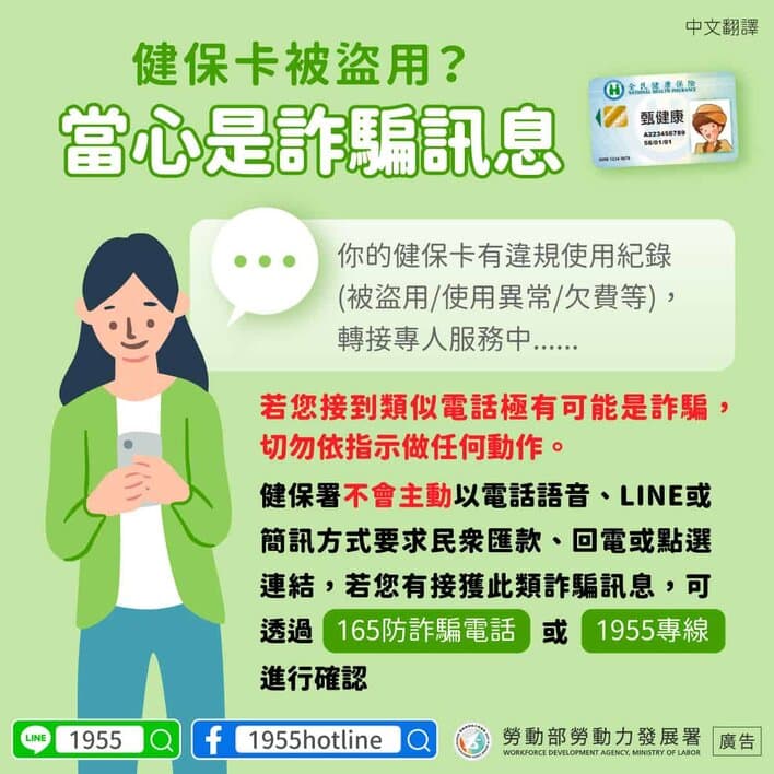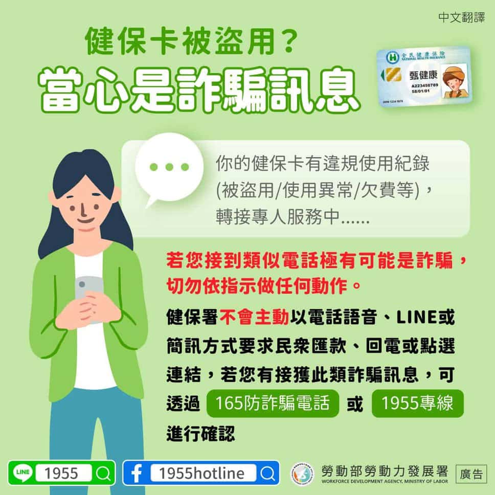 移工宣導|健保卡被盜用?當心是詐騙訊息-多國語 2023-05-30 作者: 21世紀人力仲介 媒體布小編 申請外勞專家(02)2765-1111您找到最適合的優質外籍勞工/監護工/家庭幫傭 21世紀全球外勞集團協助您找到最適合的優質外籍勞工/家庭看護工/家庭幫傭 / 製造業移工/營造業移工/農業移工,如有服務需求請來電免付費專線(手機市話皆可撥) 0800-32-1111 或 留言給我們 上一頁上一篇外籍移工|勞動部調整聘僱移工資格 草案預告7天 營造、機構等估增2.8萬名 擬6月中實施 下一篇移工仲介|移工居留逾期 仲介延誤未代辦將有罰則下一篇 產業移工|巨大遭美方暫扣 立委指製造業人心惶惶 要求勞動部盡快修法 輔導協助產業改善 2025-10-22 閱讀更多 » 外籍漁工|台日攜手 發布遠洋漁業人權報告 剖析勞動風險 有待具體應對措施 2025-10-21 閱讀更多 » 外國人|立院三讀通過韌性特別預算案 最快 11 月上旬普發現金 1 萬元 2025-10-27 閱讀更多 » 相關