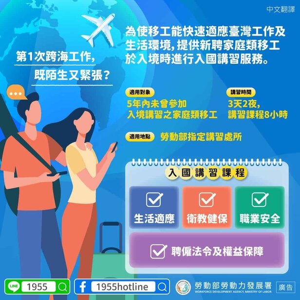 移工宣導|第1次跨海工作, 既陌生又緊張?(移工一站式服務-講習內容)-多國語 2023-03-24 作者: 21世紀人力仲介 媒體布小編 申請外勞專家(02)2765-1111您找到最適合的優質外籍勞工/監護工/家庭幫傭 21世紀全球外勞集團協助您找到最適合的優質外籍勞工/家庭看護工/家庭幫傭 / 製造業移工/營造業移工/農業移工,如有服務需求請來電免付費專線(手機市話皆可撥) 0800-32-1111 或 留言給我們 上一頁上一篇外籍移工|移民法修法 新增以生物辨識查驗身份 提高逾期居留罰鍰無共識 將擇日再審 下一篇農業移工|農業移工失聯比例高 農會仲介遭停牌 作業型態特殊 農委會將協助與勞動部反映下一篇 外籍移工|基市推移工諮商 助克服心理困擾 2025-09-25 閱讀更多 » 回收業移工|回收等業者申請移工 資格認定已發出 290 家 2025-09-24 閱讀更多 » 屏東縣外籍看護工推薦2025|要多少錢與補助申請資格、金額、流程詳解 2025-09-30 閱讀更多 » 相關