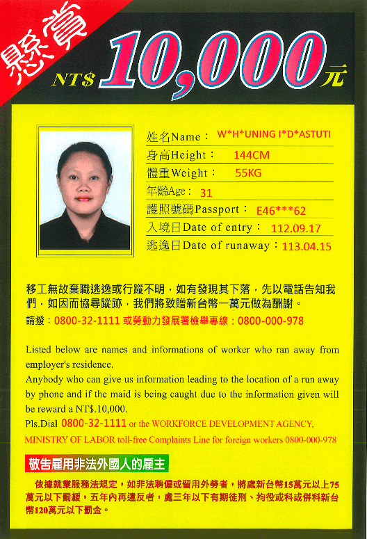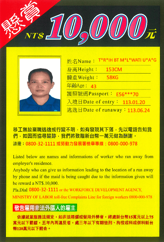 移工無故棄職逃逸或行蹤不明,如有發現其下落,先以電話告知我們,如因而協尋蹤跡,我們將致贈新台幣一萬元做為酬謝。