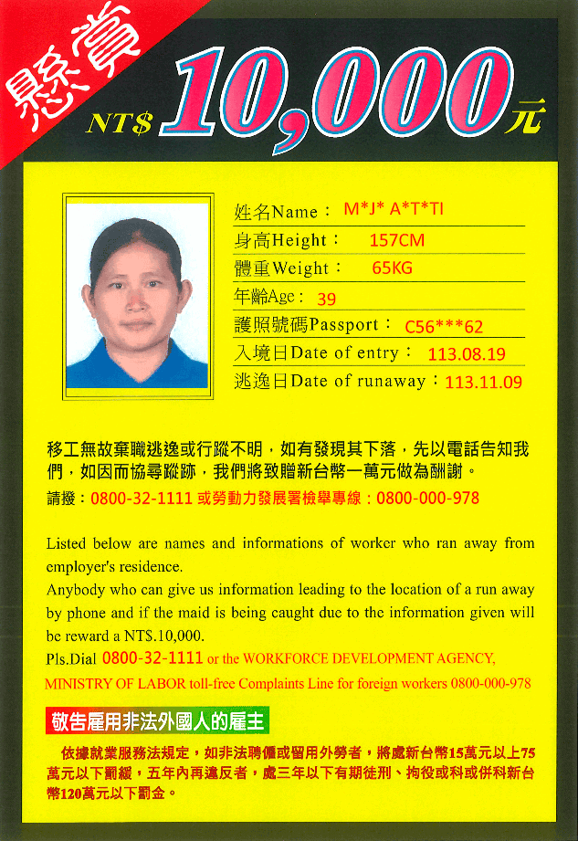 移工無故棄職逃逸或行蹤不明,如有發現其下落,先以電話告知我們,如因而協尋蹤跡,我們將致贈新台幣一萬元做為酬謝。
