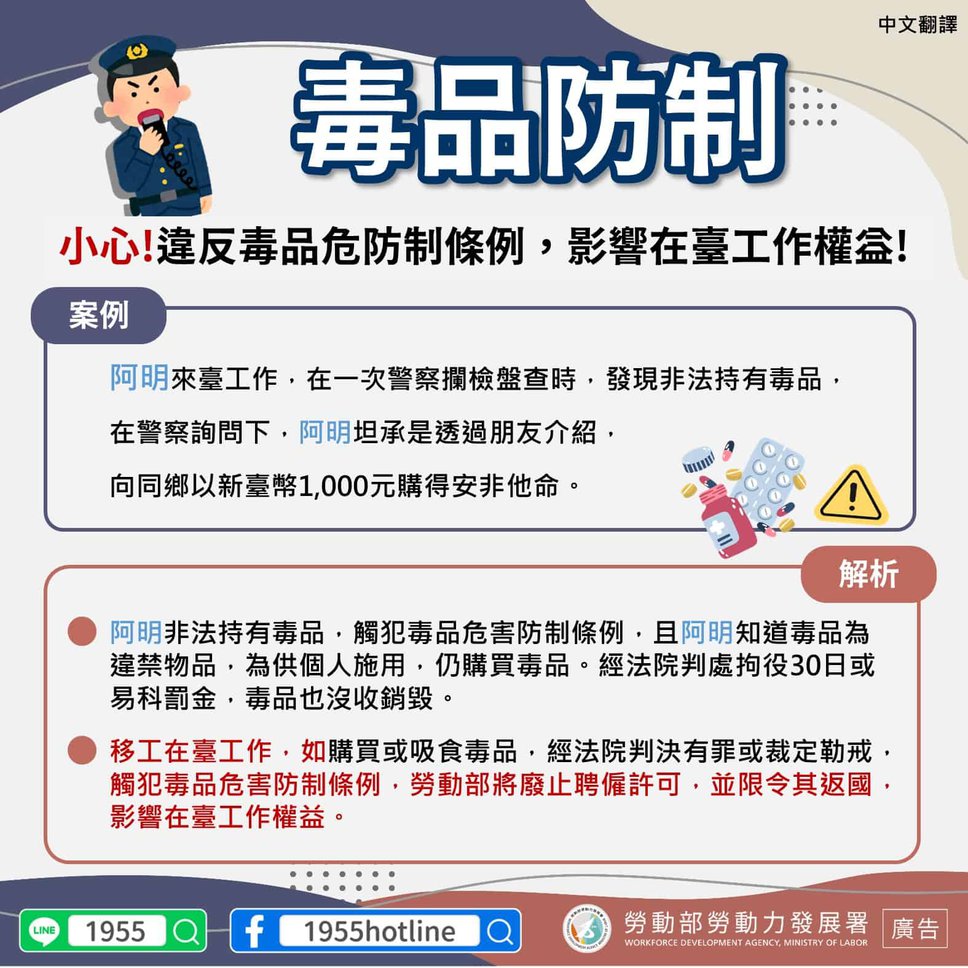 移工宣導|毒品防制-多國語 2023-12-13 作者: 21世紀人力仲介 媒體布小編 21世紀全球外勞集團協助您找到最適合的優質外籍勞工/家庭看護工/家庭幫傭 / 製造業移工/營造業移工/農業移工,如有服務需求請來電免付費專線(手機市話皆可撥) 0800-32-1111 或 留言給我們 上一頁上一篇中階技術|華語測驗 113 年考試日程出爐 全年共 6 梯次 下一篇外籍移工|監院發表移工失聯調查新書 指薪水太低許銘春:移工失聯原因多 112年失聯率已下降下一篇 移工仲介|仲介評鑑成績出爐 近期發函通知 A 級 814 家 有疑義函到 14 日內提出 2025-09-26 閱讀更多 » 外籍移工|基市推移工諮商 助克服心理困擾 2025-09-25 閱讀更多 » 屏東縣外籍看護工推薦2025|要多少錢與補助申請資格、金額、流程詳解 2025-09-30 閱讀更多 » 相關
