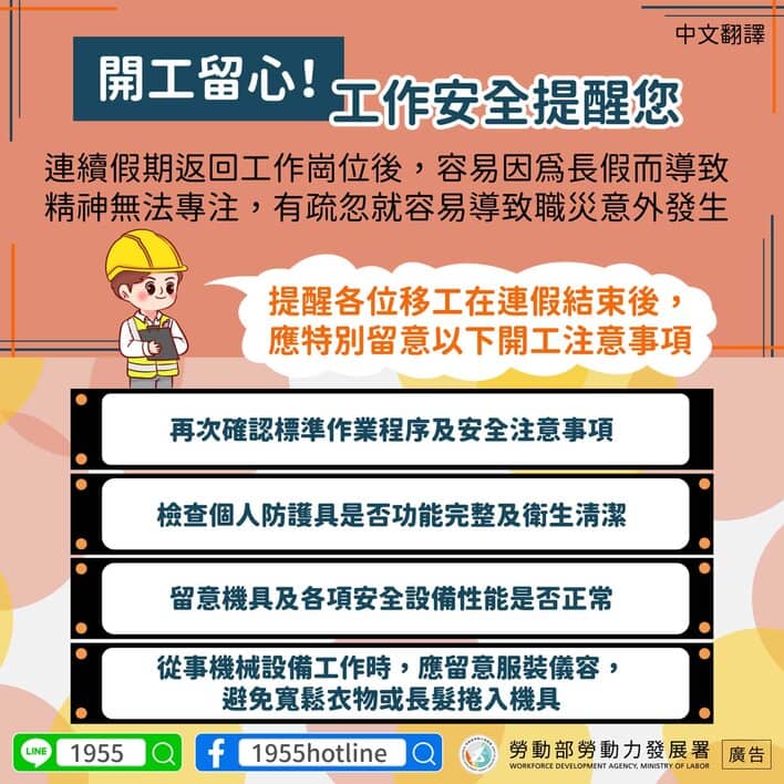 移工宣導|開工留心!工作安全提醒您-多國語 2024-02-16 作者: 21世紀人力仲介 媒體布小編 21世紀全球外勞集團協助您找到最適合的優質外籍勞工/家庭看護工/家庭幫傭 / 製造業移工/營造業移工/農業移工,如有服務需求請來電免付費專線(手機市話皆可撥) 0800-32-1111 或 留言給我們 上一頁上一篇外籍移工|外國人請領勞保老年給付逐年倍增 死亡給付 622 件 6 成申請遺屬年金給付 下一篇移工宣導|拒絕酒駕 守護自已及他人安全-多國語下一篇 外籍移工|重建處移工健康關懷 11/9 最終場 2025-10-27 閱讀更多 » 農業移工|失聯移工自組工班 侵害農民權益 立委籲充沛合法人力 農業部將爭取 2025-10-22 閱讀更多 » 外籍漁工|台日攜手 發布遠洋漁業人權報告 剖析勞動風險 有待具體應對措施 2025-10-21 閱讀更多 » 相關