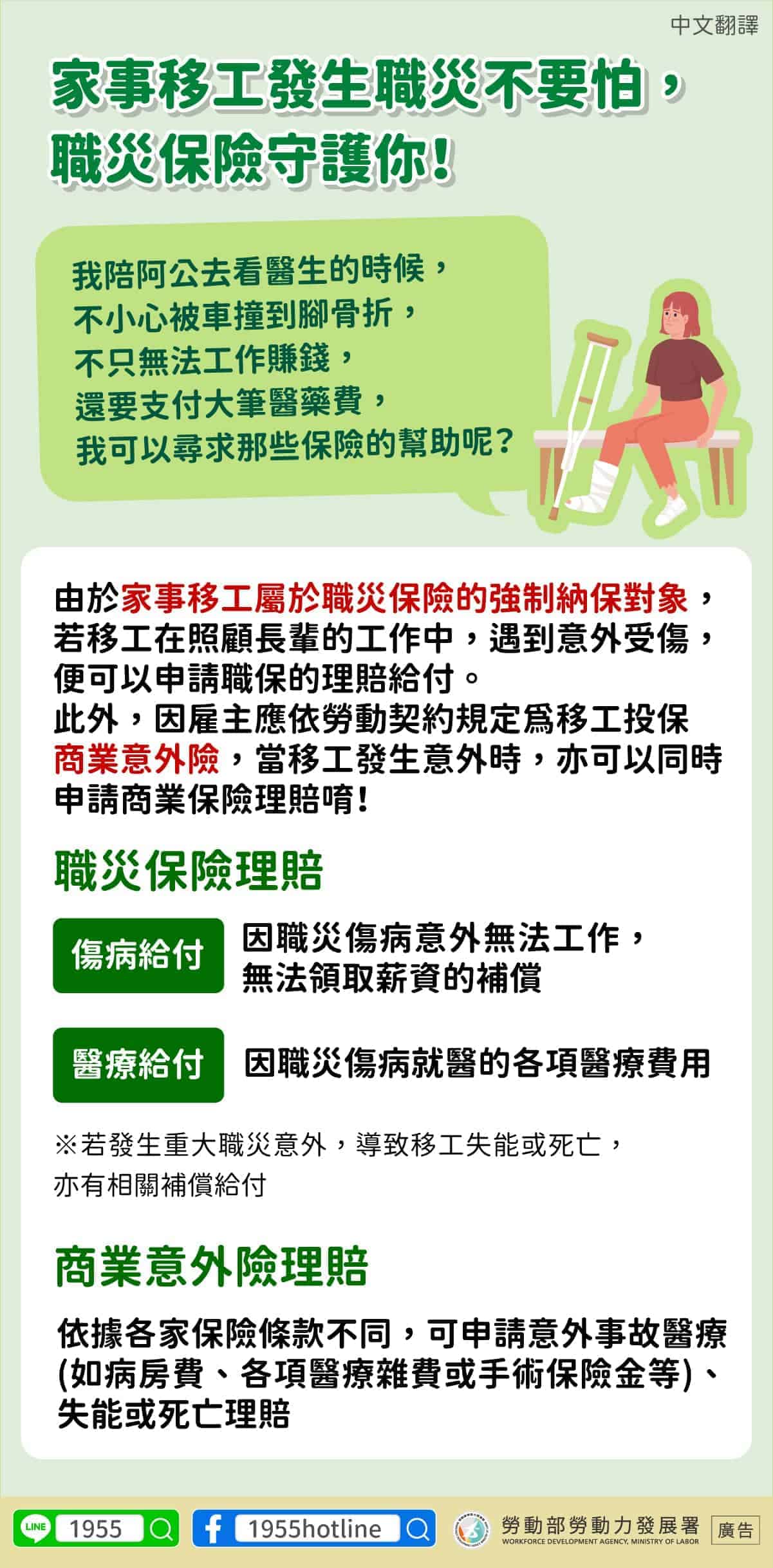 移工宣導|家事移工發生職災不要怕,職災保險守護你-多國語 2024-02-212024-02-21 作者: 21世紀人力仲介 媒體布小編 21世紀全球外勞集團協助您找到最適合的優質外籍勞工/家庭看護工/家庭幫傭 / 製造業移工/營造業移工/農業移工,如有服務需求請來電免付費專線(手機市話皆可撥) 0800-32-1111 或 留言給我們 上一頁上一篇印度移工|臺印度簽署勞工合作 MOU 雙方積極討論 下一篇營造業移工|大型營造廠申請踴躍 營造業移工開放能否嘉惠中小型廠商仍待觀察下一篇 移工仲介|重建處仲介法令研習 即日開放報名 2025-10-20 閱讀更多 » 外籍移工|台北市最新違法名單 共 103 家 總罰鍰 569 萬 未給加班費最普遍 2025-10-21 閱讀更多 » 產業移工|巨大遭美方暫扣 立委指製造業人心惶惶 要求勞動部盡快修法 輔導協助產業改善 2025-10-22 閱讀更多 » 相關