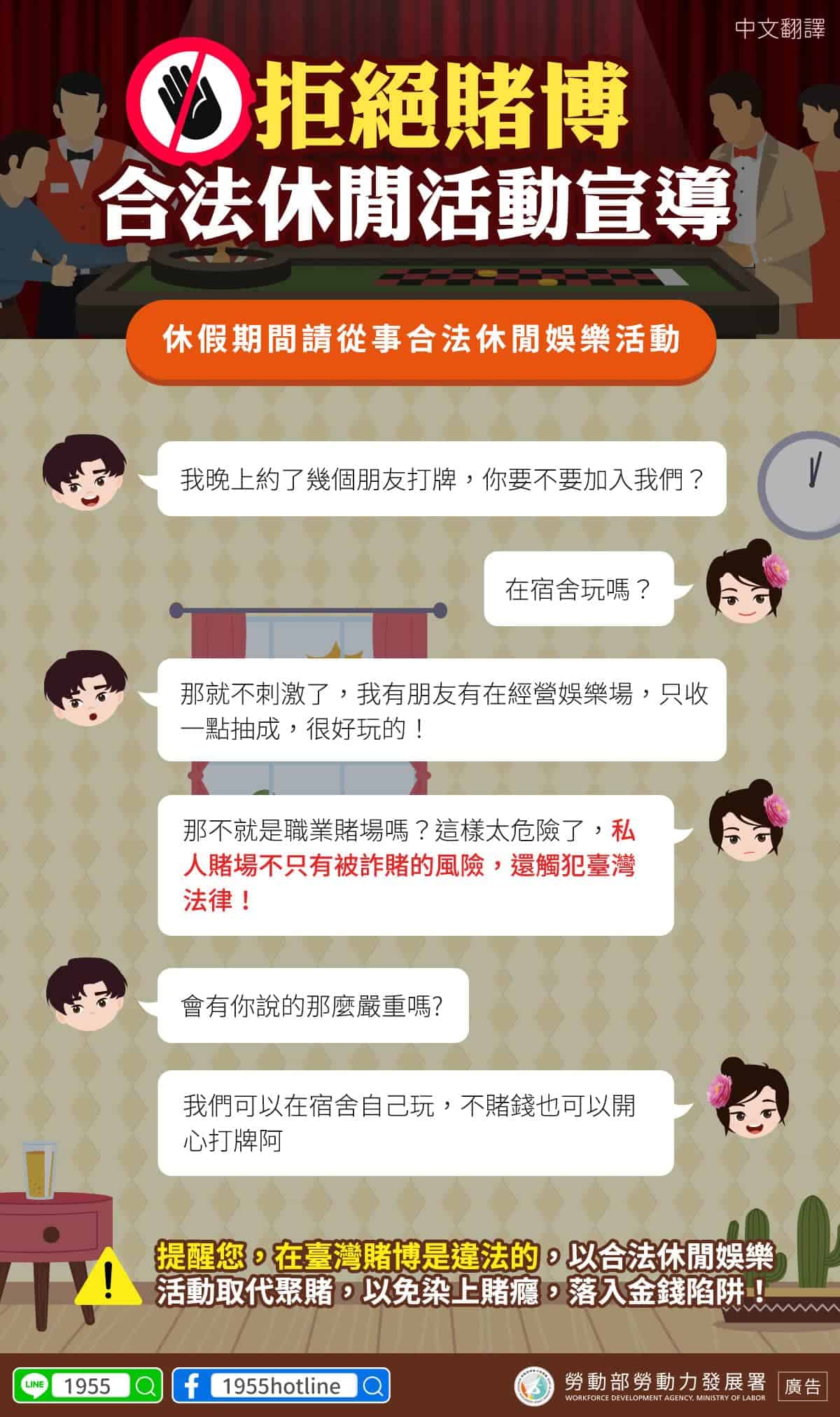 移工宣導|拒絕賭博-合法休閒活動宣導-多國語 2024-03-25 作者: 21世紀人力仲介 媒體布小編 21世紀全球外勞集團協助您找到最適合的優質外籍勞工/家庭看護工/家庭幫傭 / 製造業移工/營造業移工/農業移工,如有服務需求請來電免付費專線(手機市話皆可撥) 0800-32-1111 或 留言給我們 上一頁上一篇印度移工|印度移工將來臺 外交部長吳釗燮:雙贏局面 下一篇移工管理|失聯移工子女疑受虐 黑戶寶寶人權議題浮出 勞動部:建立移工懷孕權益指引及法律協助下一篇 外籍看護|重建處照護集中課程 12 場圓滿落幕 2025-09-30 閱讀更多 » 中階人力|因應長期人力需求 推「移工留才久用方案」 3 年逾 5 萬名轉任 照顧服務業比例最高 2025-10-01 閱讀更多 » 外籍移工|移工續聘轉換 仲介不得違法收費 2025-09-25 閱讀更多 » 相關