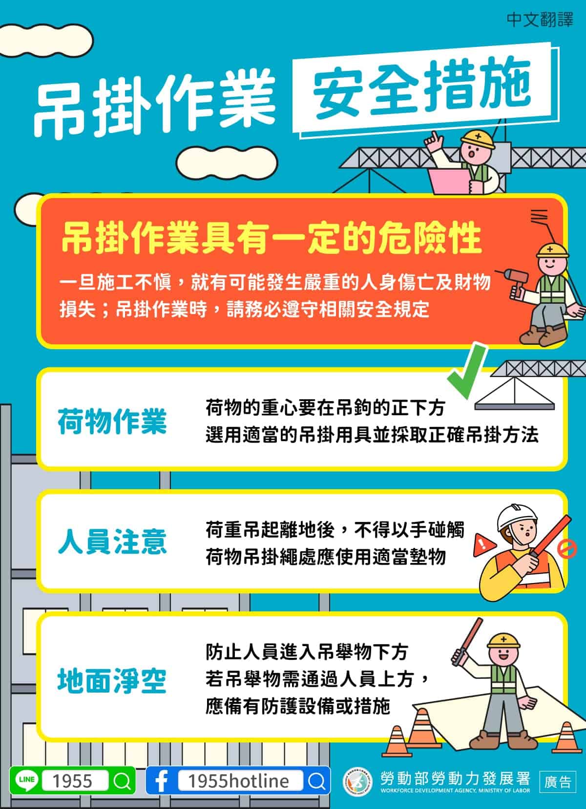 移工宣導|高空吊掛作業安全措施-多國語 2024-05-10 作者: 21世紀人力仲介 媒體布小編 21世紀全球外勞集團協助您找到最適合的優質外籍勞工/家庭看護工/家庭幫傭 / 製造業移工/營造業移工/農業移工,如有服務需求請來電免付費專線(手機市話皆可撥) 0800-32-1111 或 留言給我們 上一頁上一篇製造業移工|特定工廠聯合說明會 5/10新竹舉辦兩場 下一篇失聯移工|移工失聯居高不下 全聯會籲嚴懲非法 支持勞動部修法 建議加重發包業主責任下一篇 農業移工|失聯移工自組工班 侵害農民權益 立委籲充沛合法人力 農業部將爭取 2025-10-22 閱讀更多 » 外籍移工|台北市最新違法名單 共 103 家 總罰鍰 569 萬 未給加班費最普遍 2025-10-21 閱讀更多 » 外籍移工|重建處移工健康關懷 11/9 最終場 2025-10-27 閱讀更多 » 相關
