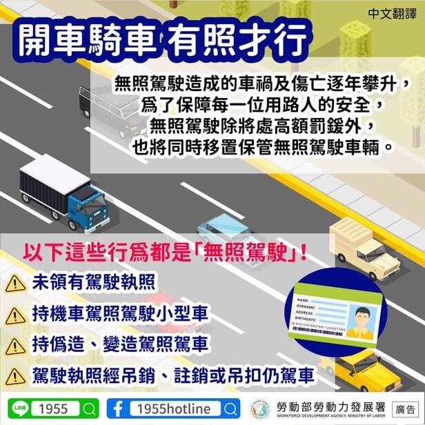 移工宣導|禁止無照駕駛-多國語移工宣導 2024-07-05 作者: 21世紀人力仲介 媒體布小編 21世紀全球外勞集團協助您找到最適合的優質外籍勞工/家庭看護工/家庭幫傭 / 製造業移工/營造業移工/農業移工,如有服務需求請來電免付費專線(手機市話皆可撥) 0800-32-1111 或 留言給我們 上一頁上一篇印度移工|臺印度 MOU 過初審 勞部:絕無政策轉彎 盼國人了解多元引進必要 回歸理性平等 下一篇菲律賓移工|無論是否因公 菲方要求雇主免費提供醫療 片面修改勞動契約惹議 全聯會發函勞動部下一篇 外籍漁工|台日攜手 發布遠洋漁業人權報告 剖析勞動風險 有待具體應對措施 2025-10-21 閱讀更多 » 農業移工|失聯移工自組工班 侵害農民權益 立委籲充沛合法人力 農業部將爭取 2025-10-22 閱讀更多 » 外籍移工|巨大集團宣布擴大零招聘費範圍 規劃補償在職移工過去支付費用 2025-10-22 閱讀更多 » 相關