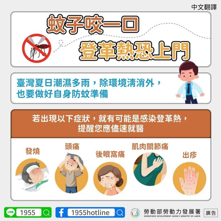 移工宣導|認識登革熱症狀-多國語 2024-07-18 作者: 21世紀人力仲介 媒體布小編 21世紀全球外勞集團協助您找到最適合的優質外籍勞工/家庭看護工/家庭幫傭 / 製造業移工/營造業移工/農業移工,如有服務需求請來電免付費專線(手機市話皆可撥) 0800-32-1111 或 留言給我們 上一頁上一篇優良移工|桃市公布優良移工名單 預計 8/25 頒獎 下一篇移工學習|臺中市免費移工中文課程 7 月再開新班下一篇 移工宣導|確診阿米巴性痢疾不用怕,就醫領藥流程一次看懂!-多國語 2025-10-23 閱讀更多 » 產業移工|8 月傳產加班、受僱人數雙降 美國對等關稅衝擊 逐漸浮現 2025-10-23 閱讀更多 » 農業移工|失聯移工自組工班 侵害農民權益 立委籲充沛合法人力 農業部將爭取 2025-10-22 閱讀更多 » 相關