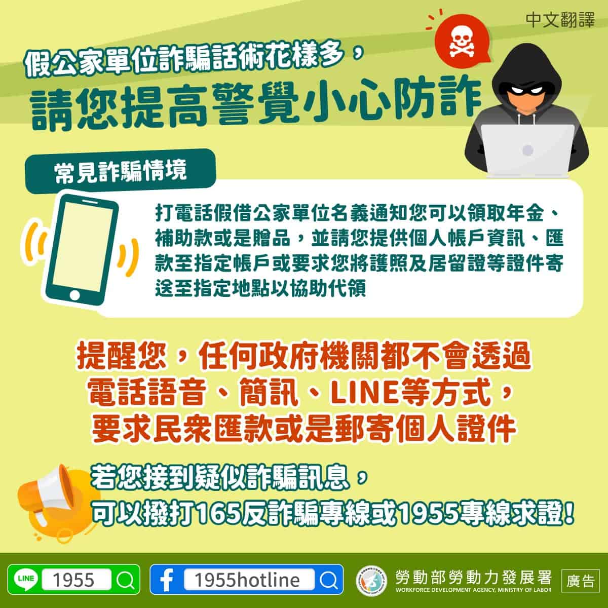 移工宣導|假公家單位詐騙話術花樣多,請您提高警覺小心防詐-多國語 2024-07-19 作者: 21世紀人力仲介 媒體布小編 21世紀全球外勞集團協助您找到最適合的優質外籍勞工/家庭看護工/家庭幫傭 / 製造業移工/營造業移工/農業移工,如有服務需求請來電免付費專線(手機市話皆可撥) 0800-32-1111 或 留言給我們 上一頁上一篇移工宣導|認識登革熱症狀-多國語 下一篇外籍移工|申請在臺一站式服務 居留屆期自動延 移工逾期居留者 需先完成處罰、報備下一篇 移工仲介|仲介評鑑成績出爐 近期發函通知 A 級 814 家 有疑義函到 14 日內提出 2025-09-26 閱讀更多 » 外籍移工|基市推移工諮商 助克服心理困擾 2025-09-25 閱讀更多 » 外籍移工|移工續聘轉換 仲介不得違法收費 2025-09-25 閱讀更多 » 相關