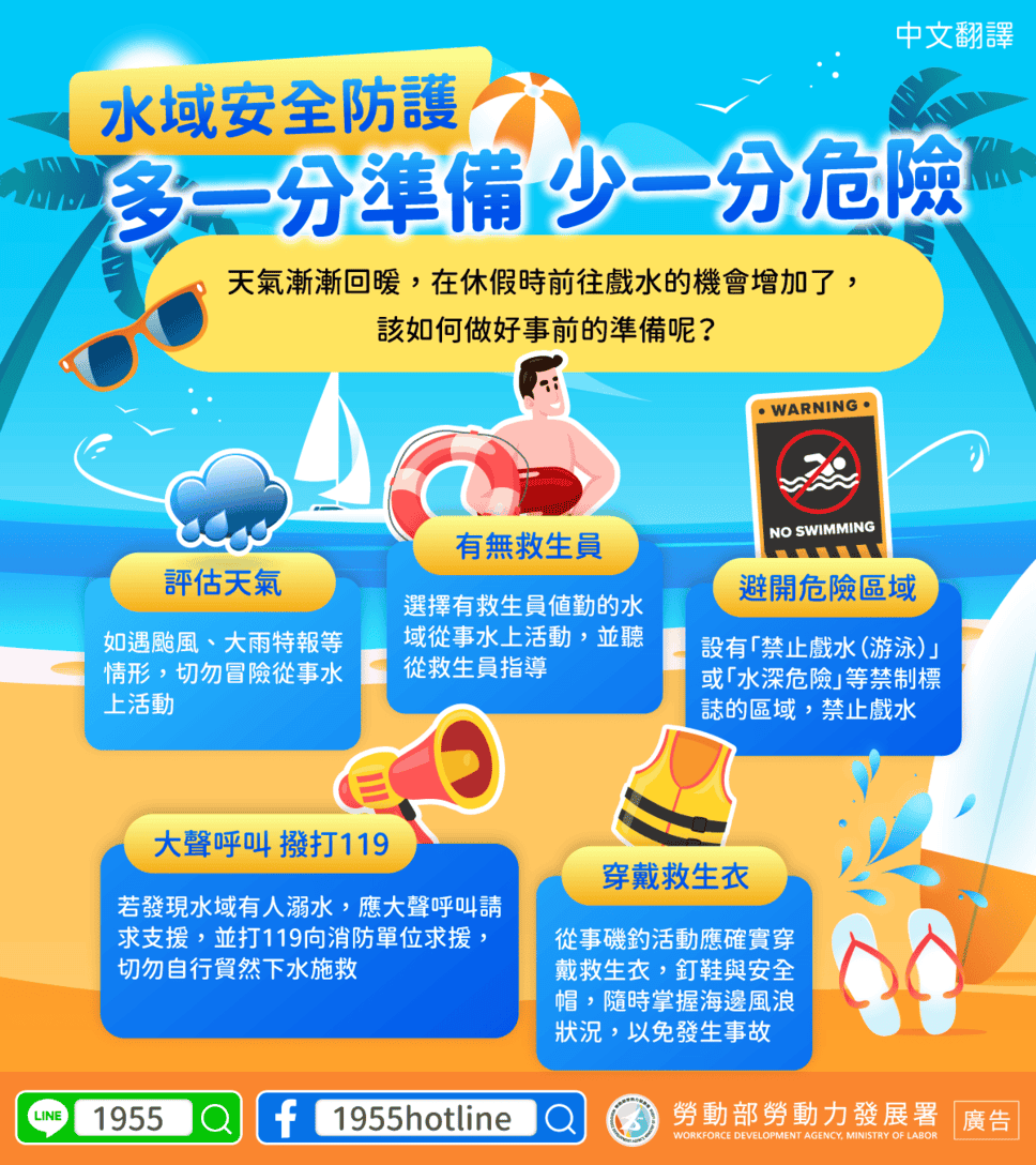 移工宣導|水域安全防護 多一分準備 少一分危險-多國語 2024-08-15 作者: 21世紀人力仲介 媒體布小編 21世紀全球外勞集團協助您找到最適合的優質外籍勞工/家庭看護工/家庭幫傭 / 製造業移工/營造業移工/農業移工,如有服務需求請來電免付費專線(手機市話皆可撥) 0800-32-1111 或 留言給我們 上一頁上一篇移工課程|新北移工華語課程 第二梯次 8/11 開始 成績優異參訓學員 勞工局補助測驗費用 下一篇移工宣導|勿隨意把個人證件提供給別人-多國語下一篇 畜牧移工|牧場主加強環境清潔 慎防類鼻疽菌 2025-10-20 閱讀更多 » 外籍移工|勞退舊制準備金計算 明年4 月納入年資滿10 年移工 2025-10-20 閱讀更多 » 移工仲介|重建處仲介法令研習 即日開放報名 2025-10-20 閱讀更多 » 相關