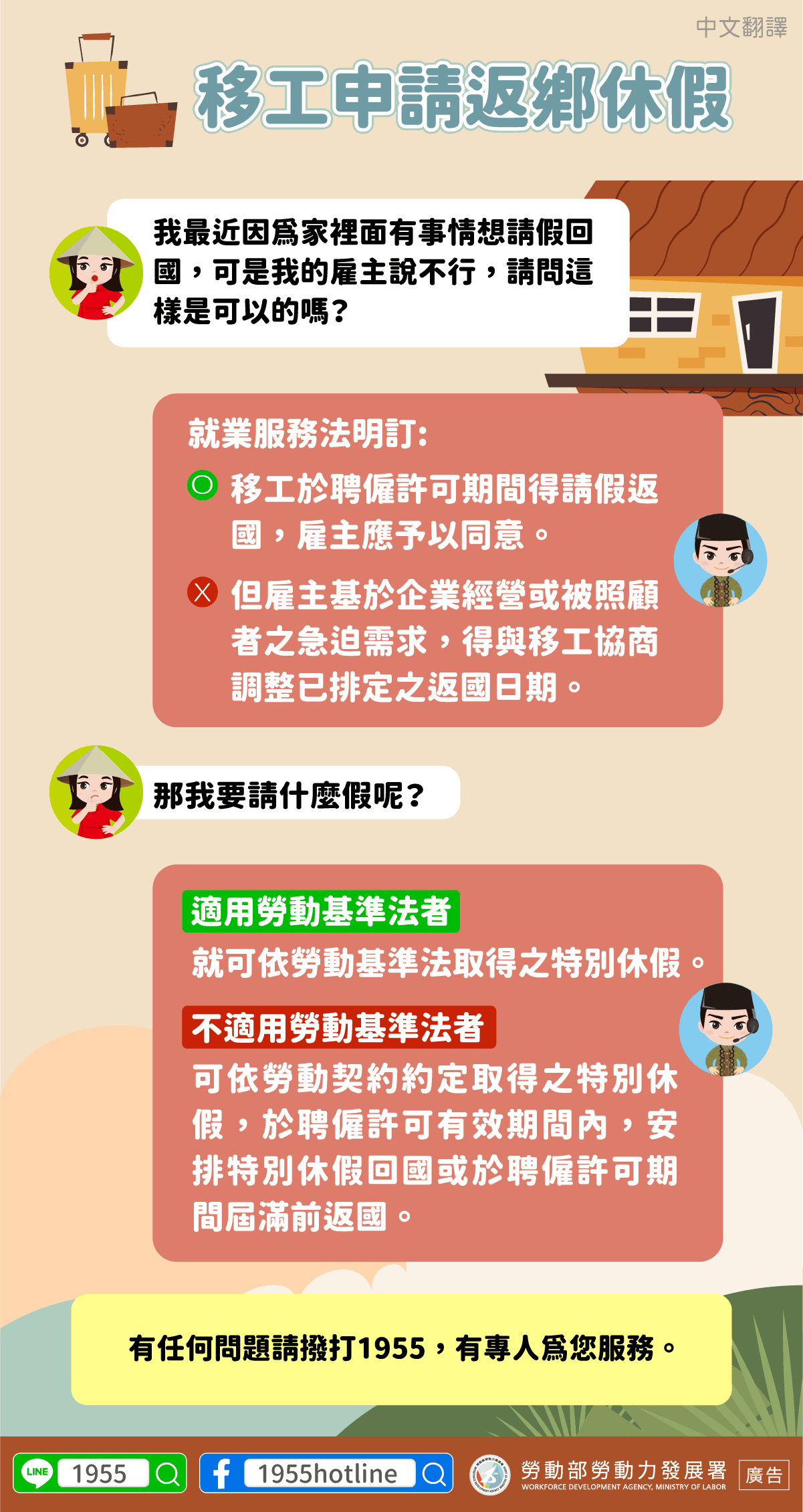 移工宣導|移工申請返鄉休假-多國語 2024-08-22 作者: 21世紀人力仲介 媒體布小編 21世紀全球外勞集團協助您找到最適合的優質外籍勞工/家庭看護工/家庭幫傭 / 製造業移工/營造業移工/農業移工,如有服務需求請來電免付費專線(手機市話皆可撥) 0800-32-1111 或 留言給我們 上一頁上一篇外籍移工|戶外熱危害新規定 勞動部辦 9 場說明會 下一篇外籍移工|桃市無違反法令證明 將全面線上申辦 9/15 前為宣導期 可即時查詢進度、補件下一篇 外籍漁工|台日攜手 發布遠洋漁業人權報告 剖析勞動風險 有待具體應對措施 2025-10-21 閱讀更多 » 移工宣導|確診阿米巴性痢疾不用怕,就醫領藥流程一次看懂!-多國語 2025-10-23 閱讀更多 » 產業移工|8 月傳產加班、受僱人數雙降 美國對等關稅衝擊 逐漸浮現 2025-10-23 閱讀更多 » 相關