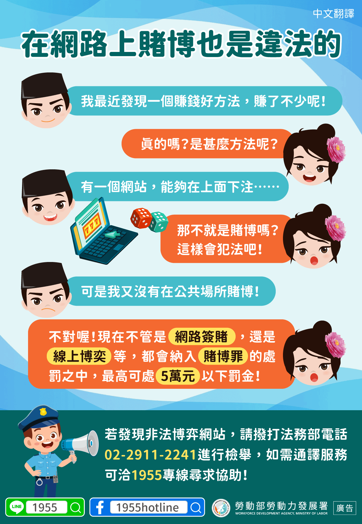 移工宣導|網路賭博也違法-多國語 2024-09-06 作者: 21世紀人力仲介 媒體布小編 21世紀全球外勞集團協助您找到最適合的優質外籍勞工/家庭看護工/家庭幫傭 / 製造業移工/營造業移工/農業移工,如有服務需求請來電免付費專線(手機市話皆可撥) 0800-32-1111 或 留言給我們 上一頁上一篇移工宣導|防堵非洲豬瘟防疫圖卡 下一篇外籍移工|全國技檢第三梯次9/5前報名 移工可申請母語服務下一篇 外籍移工|新北友善移工企業 3 家脫穎而出 多項優於法令措施 展現多元共融 2025-10-23 閱讀更多 » 農業移工|失聯移工自組工班 侵害農民權益 立委籲充沛合法人力 農業部將爭取 2025-10-22 閱讀更多 » 移工宣導|確診阿米巴性痢疾不用怕,就醫領藥流程一次看懂!-多國語 2025-10-23 閱讀更多 » 相關