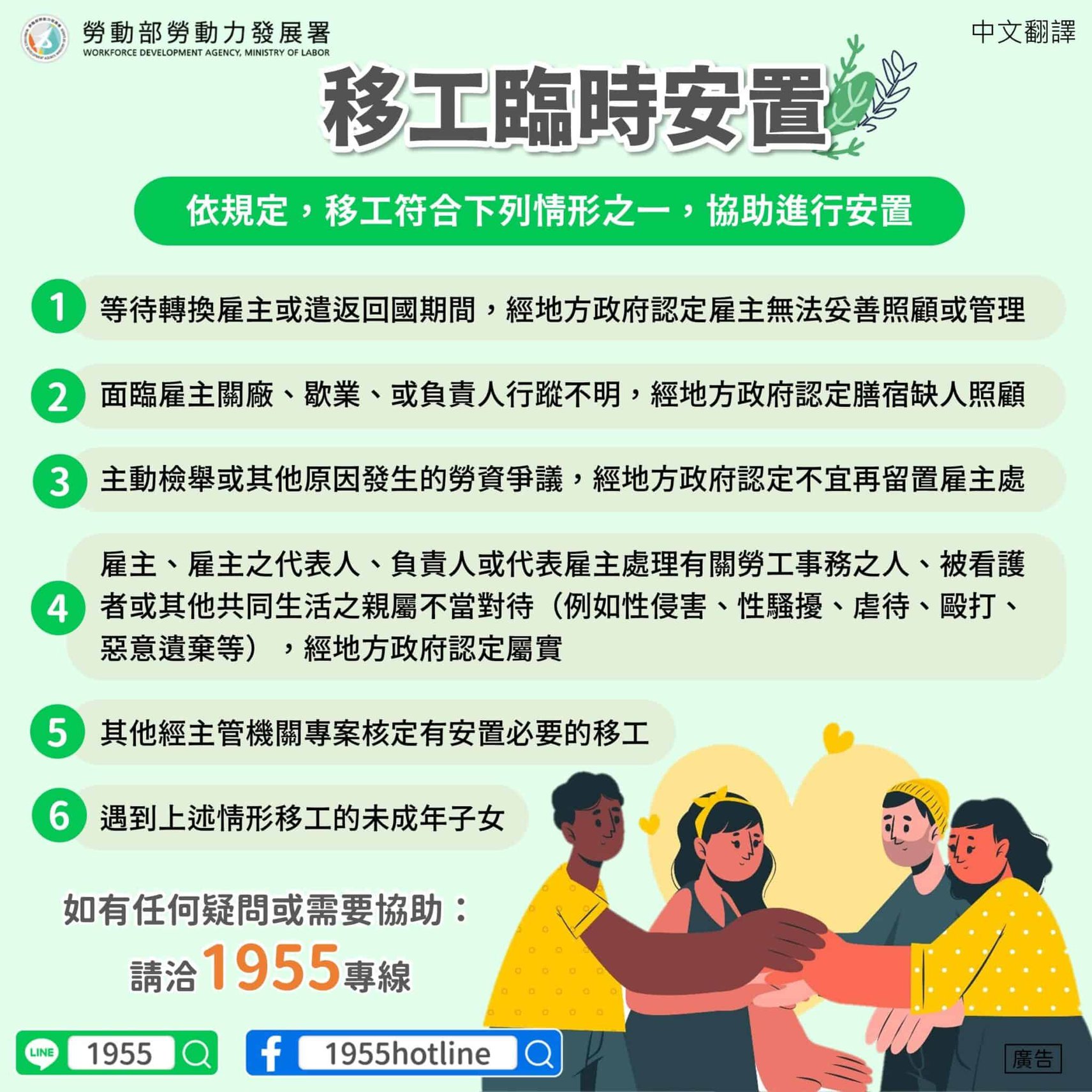 移工宣導|移工臨時安置-多國語 2024-09-20 作者: 21世紀人力仲介 媒體布小編 21世紀全球外勞集團協助您找到最適合的優質外籍勞工/家庭看護工/家庭幫傭 / 製造業移工/營造業移工/農業移工,如有服務需求請來電免付費專線(手機市話皆可撥) 0800-32-1111 或 留言給我們 上一頁上一篇製造業移工|資源化產業無工廠登記將可聘移工 估900 家受惠 下一篇外籍移工|多元文化從小扎根 新北戲劇巡演開跑 10 場社區活動 9/28 起演出 盼族群共融下一篇 產業移工|8 月傳產加班、受僱人數雙降 美國對等關稅衝擊 逐漸浮現 2025-10-23 閱讀更多 » 移工宣導|確診阿米巴性痢疾不用怕,就醫領藥流程一次看懂!-多國語 2025-10-23 閱讀更多 » 僑外生|產業輔導團升級 七大措施強化韌性 包含勞動力升級 14 萬家企業將受惠 2025-10-27 閱讀更多 » 相關