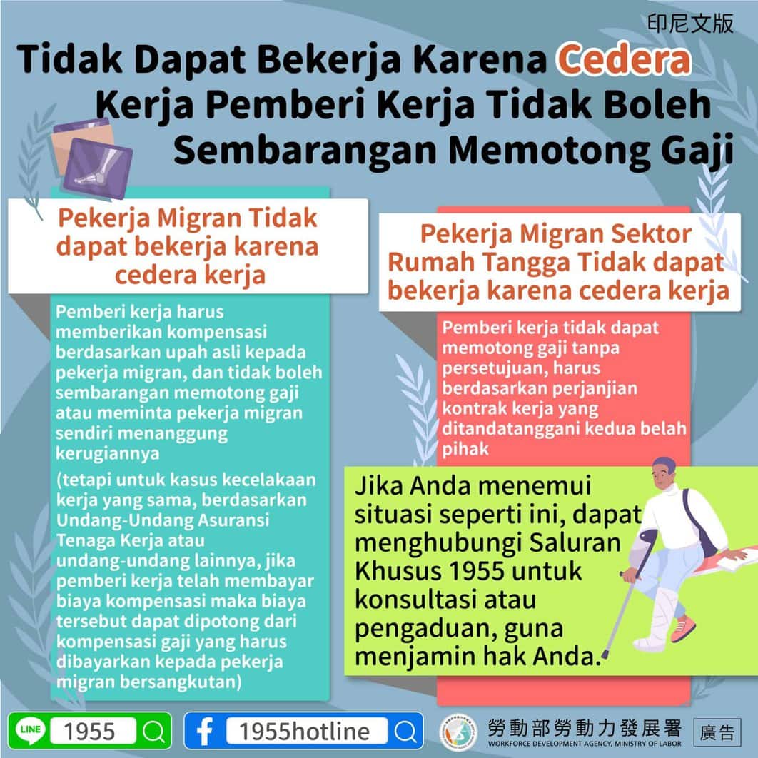 移工宣導|工作受傷無法工作,雇主不能擅自扣薪-多國語 2024-12-11 作者: 21世紀人力仲介 媒體布小編 21世紀全球外勞集團協助您找到最適合的優質外籍勞工/家庭看護工/家庭幫傭 / 製造業移工/營造業移工/農業移工,如有服務需求請來電免付費專線(手機市話皆可撥) 0800-32-1111 或 留言給我們 上一頁上一篇外籍移工|移工小額匯兌年度上限 提高至 50 萬元 增訂負責人具備相關領域專業 即日生效 下一篇外籍看護|醫療輔具注意事項-輪椅-多國語下一篇 外籍移工|重建處移工健康關懷 11/9 最終場 2025-10-27 閱讀更多 » 外籍移工|台商回流移工優惠措施 勞動部配合修法 本勞加薪增移工配額 擬 10 月底實施 2025-10-27 閱讀更多 » 外籍漁工|台日攜手 發布遠洋漁業人權報告 剖析勞動風險 有待具體應對措施 2025-10-21 閱讀更多 » 相關