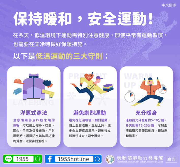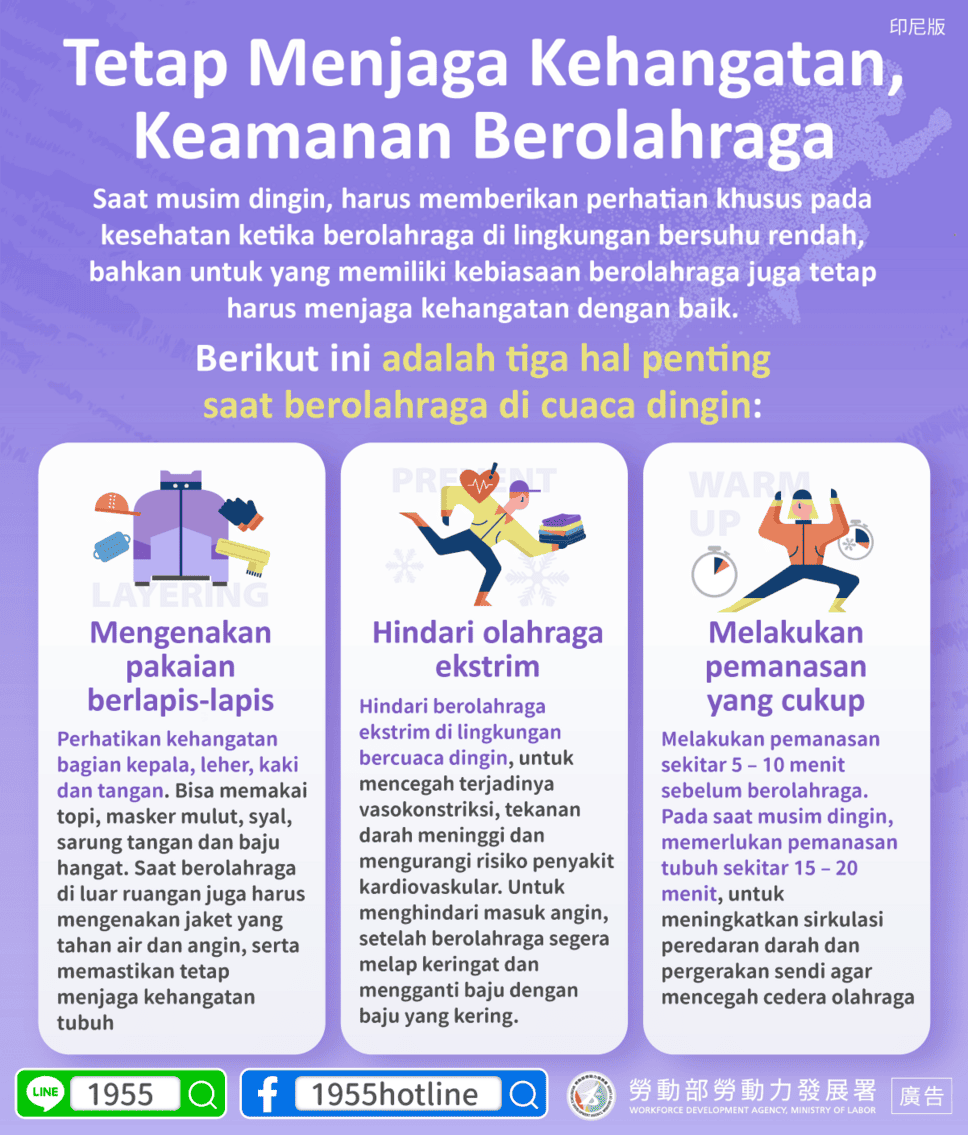 移工宣導|保持暖和,安全運動!【低溫運動守則】-多國語 2025-03-19 作者: 21世紀人力仲介 媒體布小編 21世紀全球外勞集團協助您找到最適合的優質外籍勞工/家庭看護工/家庭幫傭 / 製造業移工/營造業移工/農業移工,如有服務需求請來電免付費專線(手機市話皆可撥) 0800-32-1111 或 留言給我們 上一頁上一篇僑外生|國際專修部語言要求嚴 對外生仍有吸引力 反映臺灣教育、環境優勢 學生續留意願高 下一篇外籍移工|新北市勞資爭議調處 113 年近 4,300 件 移工協調導入通譯 協助雙方釐清爭點下一篇 外國人|立院三讀通過韌性特別預算案 最快 11 月上旬普發現金 1 萬元 2025-10-27 閱讀更多 » 移工宣導|確診阿米巴性痢疾不用怕,就醫領藥流程一次看懂!-多國語 2025-10-23 閱讀更多 » 僑外生|產業輔導團升級 七大措施強化韌性 包含勞動力升級 14 萬家企業將受惠 2025-10-27 閱讀更多 » 相關