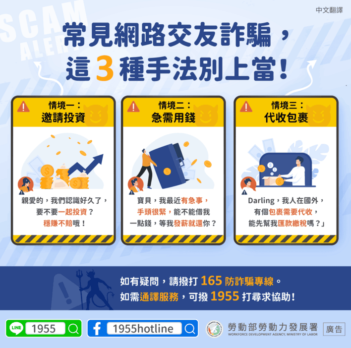移工宣導|3種常見網路交友詐騙-(詐騙)-多國語 2025-03-27 作者: 21世紀人力仲介 媒體布小編 21世紀全球外勞集團協助您找到最適合的優質外籍勞工/家庭看護工/家庭幫傭 / 製造業移工/營造業移工/農業移工,如有服務需求請來電免付費專線(手機市話皆可撥) 0800-32-1111 或 留言給我們 上一頁上一篇菲律賓移工|菲勞續聘轉換驗證期限 2 個月 臺中分處跟進 下一篇外籍移工|印勞感染登革熱 仲介未協助採檢遭罰 有症狀 24 小時內通報 違反可罰 1.5 萬元下一篇 移工宣導|確診阿米巴性痢疾不用怕,就醫領藥流程一次看懂!-多國語 2025-10-23 閱讀更多 » 外籍移工|台商回流移工優惠措施 勞動部配合修法 本勞加薪增移工配額 擬 10 月底實施 2025-10-27 閱讀更多 » 僑外生|產業輔導團升級 七大措施強化韌性 包含勞動力升級 14 萬家企業將受惠 2025-10-27 閱讀更多 » 相關