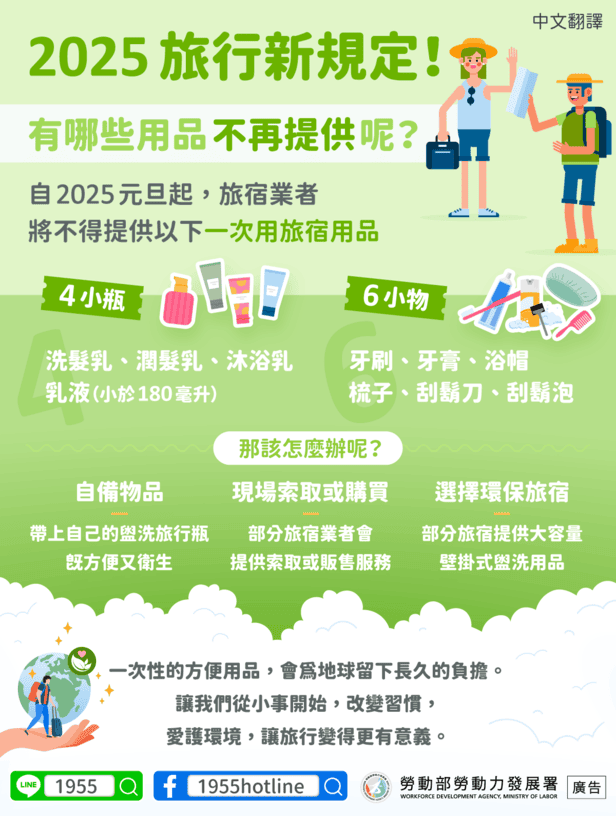 移工宣導|2025旅行新規定!有哪些用品不再提供呢(生活)-多國語 2025-05-05 作者: 21世紀人力仲介 媒體布小編 21世紀全球外勞集團協助您找到最適合的優質外籍勞工/家庭看護工/家庭幫傭 / 製造業移工/營造業移工/農業移工,如有服務需求請來電免付費專線(手機市話皆可撥) 0800-32-1111 或 留言給我們 上一頁上一篇移工活動|「2025 大新竹移工籃球賽」 歡迎全國移工報名參加 下一篇僑外生|優化補助程序 僑委會修正產攜專班經費作業要點下一篇 營造業移工|一般營造業移工 實際引進約總額 6 成 2 2025-09-24 閱讀更多 » 外籍幫傭|卓揆指示依政策影響評估 審慎研議外傭放寬政策 2025-09-25 閱讀更多 » 移工宣導|透過「金融監督管理委員會核准」的合法小額匯兌業者匯錢,一年最多50萬!-多國語 2025-09-24 閱讀更多 » 相關