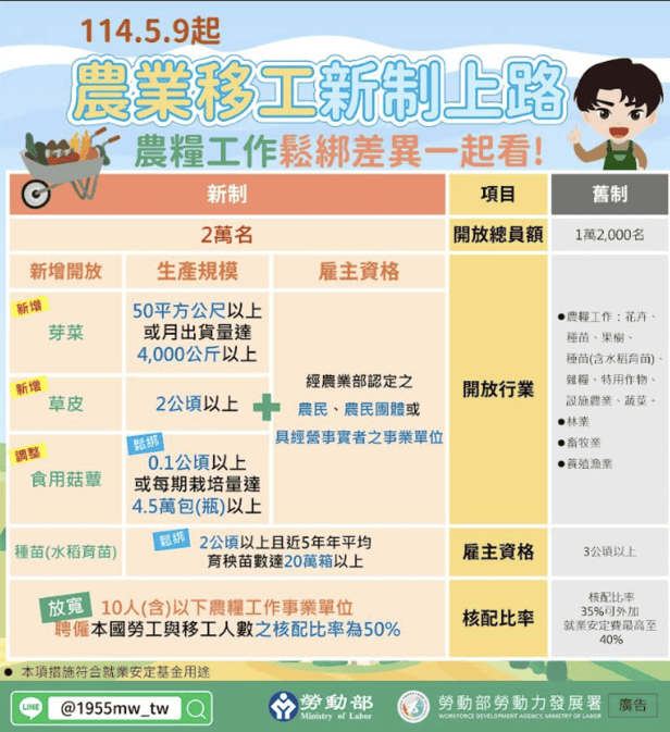 農業移工|114年5月9日起農業移工新制上路 農糧工作鬆綁差異一起看 2025-05-15 作者: 21世紀人力仲介 媒體布小編 21世紀全球外勞集團協助您找到最適合的優質外籍勞工/家庭看護工/家庭幫傭 / 製造業移工/營造業移工/農業移工,如有服務需求請來電免付費專線(手機市話皆可撥) 0800-32-1111 或 留言給我們 上一頁上一篇中階人力|移工升格中階人力 須提撥舊制勞退金 新制上路後 嘉義縣新增 86 家設立專戶 下一篇外勞人力仲介服務收費標準懶人包 : 請仲介服務費要多少錢下一篇 外籍移工|新北友善移工企業 3 家脫穎而出 多項優於法令措施 展現多元共融 2025-10-23 閱讀更多 » 僑外生|產業輔導團升級 七大措施強化韌性 包含勞動力升級 14 萬家企業將受惠 2025-10-27 閱讀更多 » 外籍移工|重建處移工健康關懷 11/9 最終場 2025-10-27 閱讀更多 » 相關