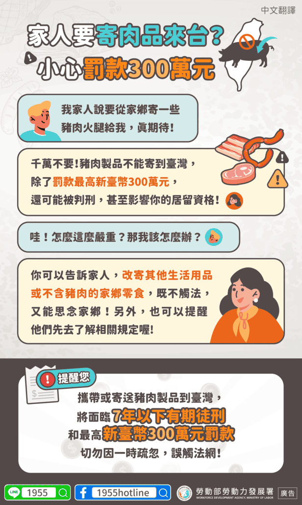 移工宣導|家人要寄肉品來臺,小心罰款300萬!(防疫)-多國語 2025-05-22 作者: 21世紀人力仲介 媒體布小編21世紀全球外勞集團協助您找到最適合的優質外籍勞工/家庭看護工/家庭幫傭 / 製造業移工/營造業移工/農業移工,如有服務需求請來電免付費專線(手機市話皆可撥) 0800-32-1111 或 留言給我們 上一頁上一篇移工活動|南市勞雇一家親 帶領移工家庭走向戶外 下一篇僑外生|攬才專法進階 放寬僑外生尋職期打工 外國專業人才適用勞退新制 擴大對象下一篇 外籍移工|災後重建 13 個部會提專案報告 無薪假移工支援農業 勞動部允研究 2025-10-17 閱讀更多 » 外籍移工|巨大集團宣布擴大零招聘費範圍 規劃補償在職移工過去支付費用 2025-10-22 閱讀更多 » 外籍看護|外籍看護制度僵化 亟待與時俱進 2025-10-16 閱讀更多 » 相關