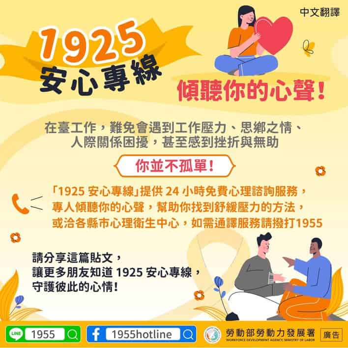 移工宣導|1925安心專線傾聽你的心聲-(健康)-多國語 2025-06-05 作者: 21世紀人力仲介 媒體布小編 21世紀全球外勞集團協助您找到最適合的優質外籍勞工/家庭看護工/家庭幫傭 / 製造業移工/營造業移工/農業移工,如有服務需求請來電免付費專線(手機市話皆可撥) 0800-32-1111 或 留言給我們 上一頁上一篇移工仲介|執行 113 年仲介評鑑工作 工協承辦 實地評鑑擬 6 月底展開 受評 1,223 家 下一篇長照2.0補助申請教學2025:申請資格/服務對象/補助懶人包下一篇 外籍幫傭|釋出婦女勞動力 賴總統提鬆綁外籍家庭幫傭 確保托育品質等前提下 洪申翰:正在評估中 2025-10-17 閱讀更多 » 外籍移工|新北友善移工企業 3 家脫穎而出 多項優於法令措施 展現多元共融 2025-10-23 閱讀更多 » 外籍漁工|台日攜手 發布遠洋漁業人權報告 剖析勞動風險 有待具體應對措施 2025-10-21 閱讀更多 » 相關