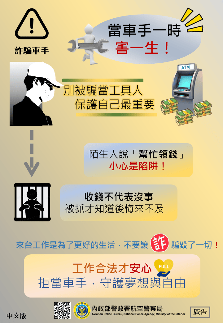 移工宣導|當車手一時 害一生!多國語 2025-07-14 作者: 21世紀人力仲介 媒體布小編 21世紀全球外勞集團協助您找到最適合的優質外籍勞工/家庭看護工/家庭幫傭 / 製造業移工/營造業移工/農業移工,如有服務需求請來電免付費專線(手機市話皆可撥) 0800-32-1111 或 留言給我們 上一頁上一篇移工宣導|瓦斯罐使用安全守則(生活)-多國語言 下一篇移工留才久用方案2025懶人包|優缺點與家庭看護如何申請下一篇 外籍漁工|台日攜手 發布遠洋漁業人權報告 剖析勞動風險 有待具體應對措施 2025-10-21 閱讀更多 » 畜牧移工|牧場主加強環境清潔 慎防類鼻疽菌 2025-10-20 閱讀更多 » 外籍移工|新北友善移工企業 3 家脫穎而出 多項優於法令措施 展現多元共融 2025-10-23 閱讀更多 » 相關