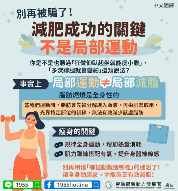 移工宣導|別再被騙了!減肥成功的關鍵不是局部運動(健康)-多國語 2025-07-28 作者: 21世紀人力仲介 媒體布小編 21世紀全球外勞集團協助您找到最適合的優質外籍勞工/家庭看護工/家庭幫傭 / 製造業移工/營造業移工/農業移工,如有服務需求請來電免付費專線(手機市話皆可撥) 0800-32-1111 或 留言給我們 上一頁上一篇外籍移工|勞工具舊制年資 勞雇雙方可協議結清 符合三項條件 即可動支台銀專戶金額 下一篇失聯移工|源頭管控 114 年第 1 次查核外仲結果出爐下一篇 長輩送護理之家 vs 請外籍看護:費用、服務、優缺點完整比較【2025最新】 2025-10-17 閱讀更多 » 外籍移工|台北市最新違法名單 共 103 家 總罰鍰 569 萬 未給加班費最普遍 2025-10-21 閱讀更多 » 外籍移工|勞退舊制準備金計算 明年4 月納入年資滿10 年移工 2025-10-20 閱讀更多 » 相關