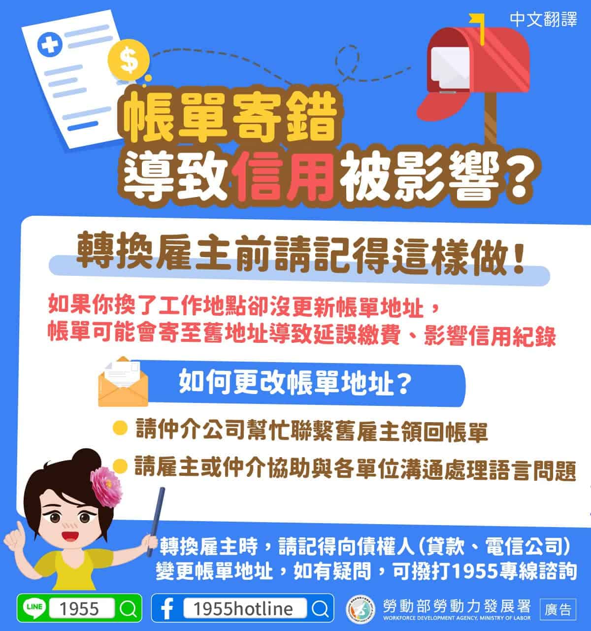 移工宣導|帳單寄錯導致信用被影響?轉換雇主前請記得這樣做!(生活)-多國語 2025-08-20 作者: 21世紀人力仲介 媒體布小編 21世紀全球外勞集團協助您找到最適合的優質外籍勞工/家庭看護工/家庭幫傭 / 製造業移工/營造業移工/農業移工,如有服務需求請來電免付費專線(手機市話皆可撥) 0800-32-1111 或 留言給我們 上一頁上一篇外籍移工|雇主申報移工健保投(退)保QA 下一篇外籍移工|加強移工宿舍清消 避免孳生病媒蚊下一篇 僑外生|日籍學位生近 10 年成長 1.5 倍 外國專業人員卻呈下降趨勢居第 4 2025-09-30 閱讀更多 » 移工宣導|使用人工智慧程式,這5種資訊千萬別透露!-多國語 2025-09-26 閱讀更多 » 僑外生|配合攬才政策營造友善就學環境 教育部放寬外國學生申請次數限制 2025-09-26 閱讀更多 » 相關