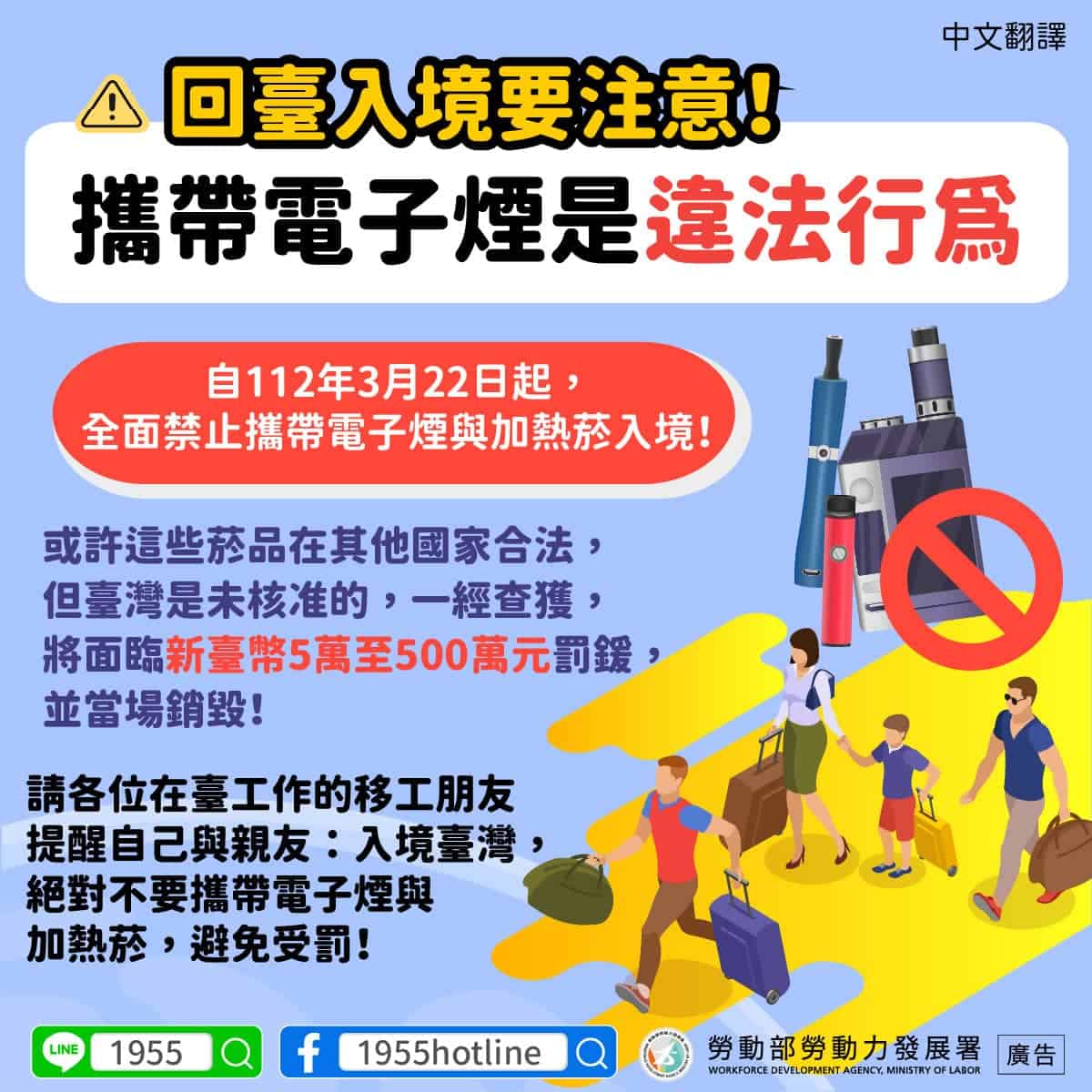 移工宣導|回臺入境要注意!攜帶電子煙是違法行為-多國語 2025-09-04 作者: 21世紀人力仲介 媒體布小編 21世紀全球外勞集團協助您找到最適合的優質外籍勞工/家庭看護工/家庭幫傭 / 製造業移工/營造業移工/農業移工,如有服務需求請來電免付費專線(手機市話皆可撥) 0800-32-1111 或 留言給我們 上一頁上一篇中階人力|強化中階人力 填補營建技術勞工缺口 下一篇外籍移工|工總 2025 年白皮書 提 148 項建議 缺工連年高居榜首 籲鬆綁移工引進下一篇 外籍看護|重建處照護集中課程 12 場圓滿落幕 2025-09-30 閱讀更多 » 中階人力|因應長期人力需求 推「移工留才久用方案」 3 年逾 5 萬名轉任 照顧服務業比例最高 2025-10-01 閱讀更多 » 僑外生|半導體帶動 科學園區營業額創新高 前半年 2.74 兆元 人力需求持續向上 2025-09-30 閱讀更多 » 相關