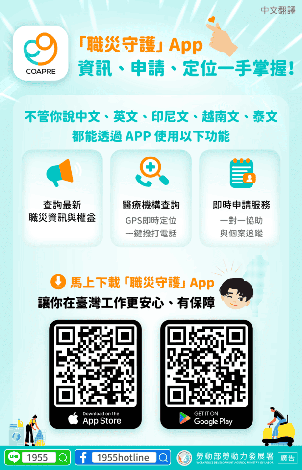 移工宣導|「職災守護」App,資訊、申請、定位一手掌握!(勞權)-多國語 2025-09-09 作者: 21世紀人力仲介 媒體布小編 21世紀全球外勞集團協助您找到最適合的優質外籍勞工/家庭看護工/家庭幫傭 / 製造業移工/營造業移工/農業移工,如有服務需求請來電免付費專線(手機市話皆可撥) 0800-32-1111 或 留言給我們 上一頁上一篇外籍移工|經濟放緩 吳東亮盼工資不要調整 房務人員缺口大 開放服務業引進移工 下一篇2025 彰化縣外籍看護工補助與申請指南|費用、補助資格、金額、流程詳解下一篇 外籍移工|截至第二季 雇主違反就服法有 2 千餘件 聘僱未經許可外國人 遭罰鍰近 800 件 2025-10-17 閱讀更多 » 畜牧移工|牧場主加強環境清潔 慎防類鼻疽菌 2025-10-20 閱讀更多 » 移工仲介|重建處仲介法令研習 即日開放報名 2025-10-20 閱讀更多 » 相關
