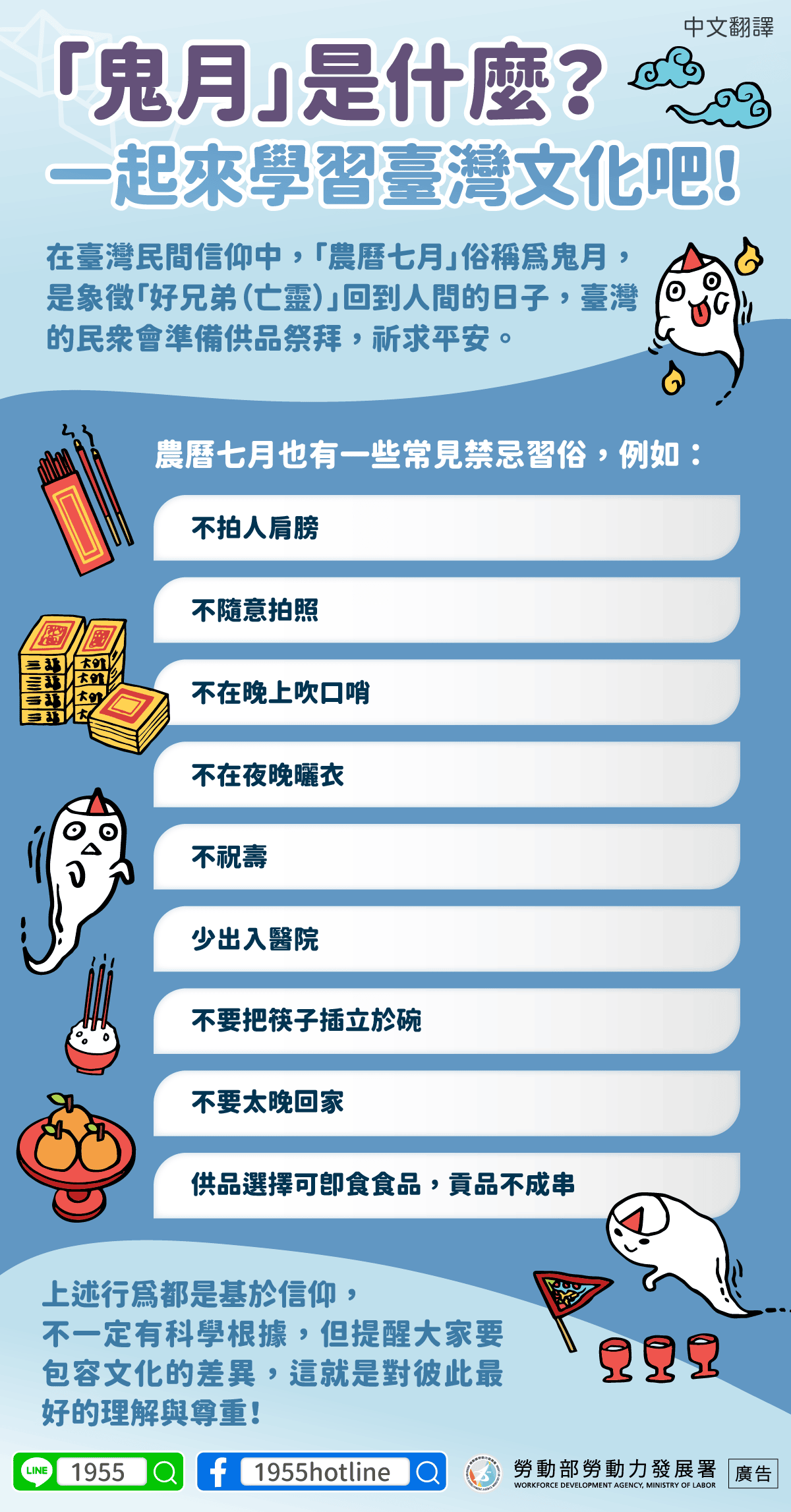 移工宣導|「鬼月」是什麼?一起來學習臺灣文化吧!-多國語 2025-09-10 作者: 21世紀人力仲介 媒體布小編 21世紀全球外勞集團協助您找到最適合的優質外籍勞工/家庭看護工/家庭幫傭 / 製造業移工/營造業移工/農業移工,如有服務需求請來電免付費專線(手機市話皆可撥) 0800-32-1111 或 留言給我們 上一頁上一篇2025 彰化縣外籍看護工補助與申請指南|費用、補助資格、金額、流程詳解 下一篇移工活動|新北移工多元戲劇巡演 首場在板橋下一篇 僑外生|產業輔導團升級 七大措施強化韌性 包含勞動力升級 14 萬家企業將受惠 2025-10-27 閱讀更多 » 外籍移工|台北市最新違法名單 共 103 家 總罰鍰 569 萬 未給加班費最普遍 2025-10-21 閱讀更多 » 外籍移工|巨大集團宣布擴大零招聘費範圍 規劃補償在職移工過去支付費用 2025-10-22 閱讀更多 » 相關