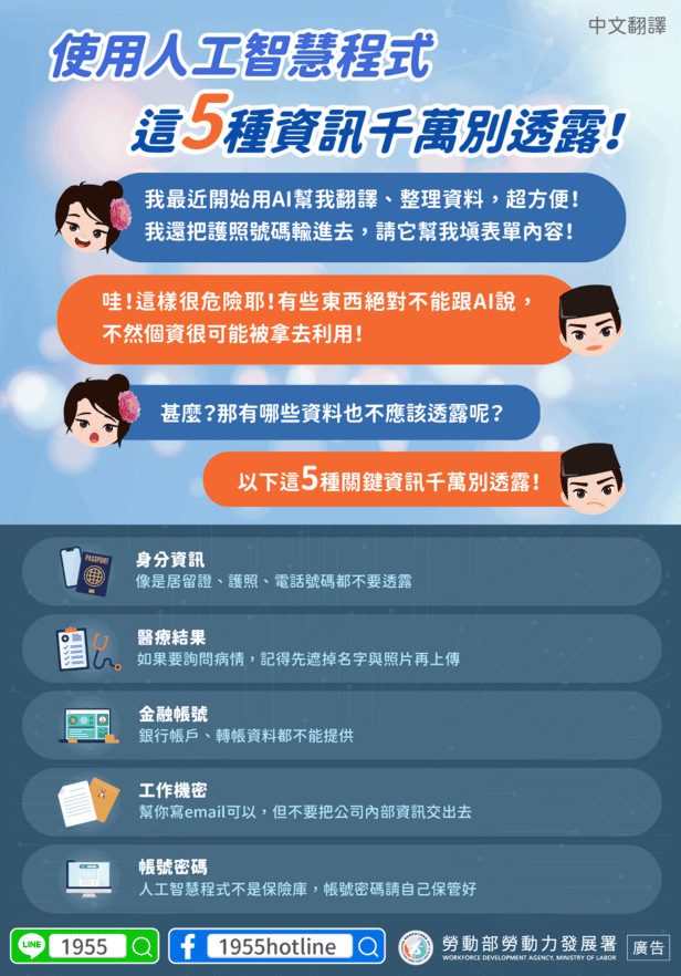 移工宣導|使用人工智慧程式,這5種資訊千萬別透露!-多國語 2025-09-26 作者: 21世紀人力仲介 媒體布小編 21世紀全球外勞集團協助您找到最適合的優質外籍勞工/家庭看護工/家庭幫傭 / 製造業移工/營造業移工/農業移工,如有服務需求請來電免付費專線(手機市話皆可撥) 0800-32-1111 或 留言給我們 上一頁上一篇外籍移工|基市推移工諮商 助克服心理困擾 下一篇僑外生|半導體帶動 科學園區營業額創新高 前半年 2.74 兆元 人力需求持續向上下一篇 移工宣導|使用人工智慧程式,這5種資訊千萬別透露!-多國語 2025-09-26 閱讀更多 » 移工宣導|透過「金融監督管理委員會核准」的合法小額匯兌業者匯錢,一年最多50萬!-多國語 2025-09-24 閱讀更多 » 僑外生|配合攬才政策營造友善就學環境 教育部放寬外國學生申請次數限制 2025-09-26 閱讀更多 » 相關