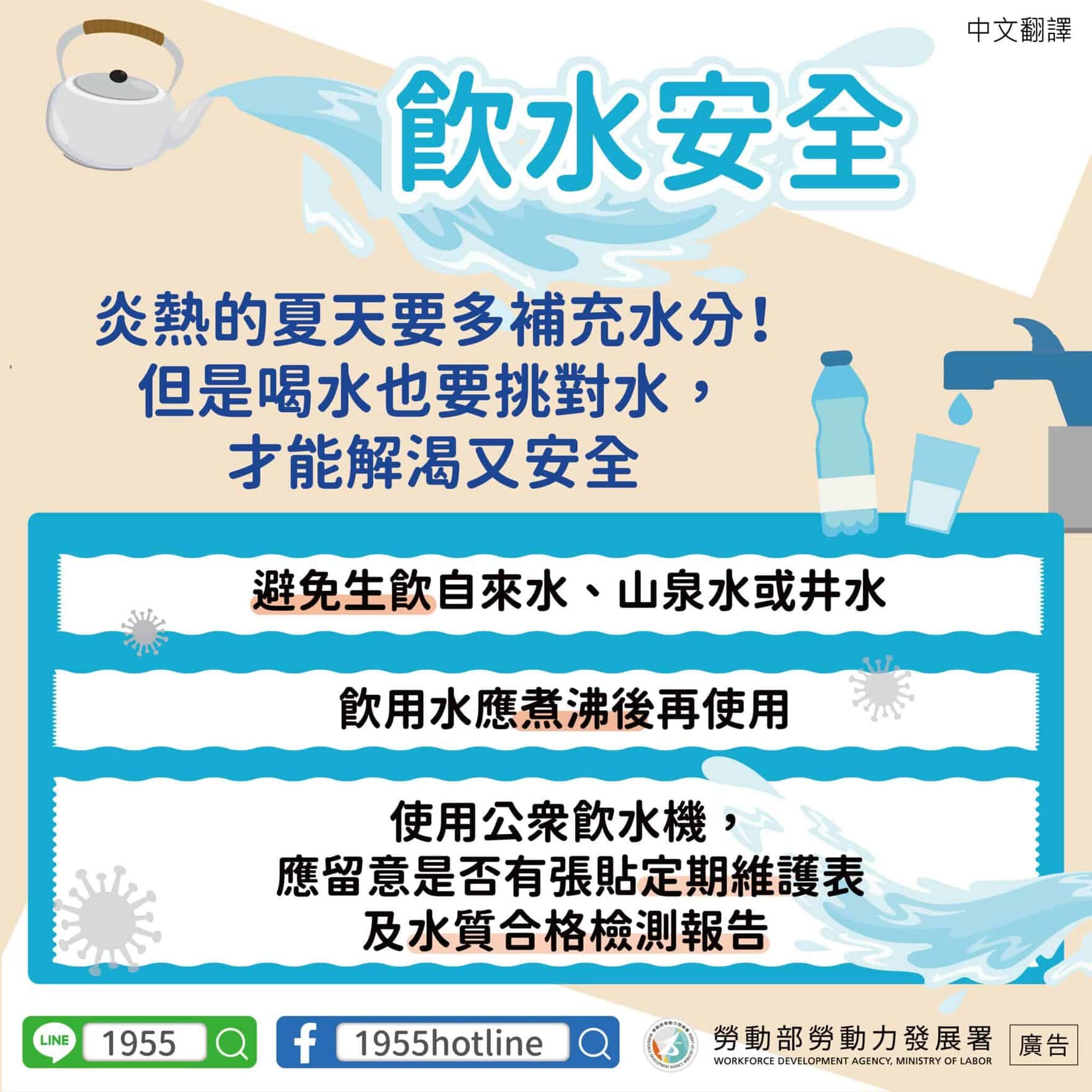 移工宣導|飲水安全-多國語 2023-10-05 作者: 21世紀人力仲介 媒體布小編 21世紀全球外勞集團協助您找到最適合的優質外籍勞工/家庭看護工/家庭幫傭 / 製造業移工/營造業移工/農業移工,如有服務需求請來電免付費專線(手機市話皆可撥) 0800-32-1111 或 留言給我們 上一頁上一篇外籍移工|業者疾呼鬆綁資格 重新思考移工定位 供需失衡、成本拉升 成當前主要挑戰 下一篇外籍移工|因故無法引進移工去年 3.3 萬件申請延長 簡政便民 修法不須申請即自動延長一次下一篇 外國人|立院三讀通過韌性特別預算案 最快 11 月上旬普發現金 1 萬元 2025-10-27 閱讀更多 » 產業移工|巨大遭美方暫扣 立委指製造業人心惶惶 要求勞動部盡快修法 輔導協助產業改善 2025-10-22 閱讀更多 » 農業移工|失聯移工自組工班 侵害農民權益 立委籲充沛合法人力 農業部將爭取 2025-10-22 閱讀更多 » 相關