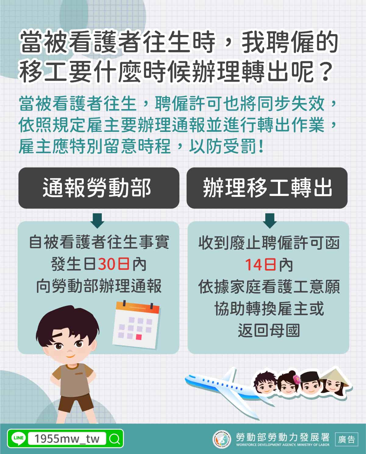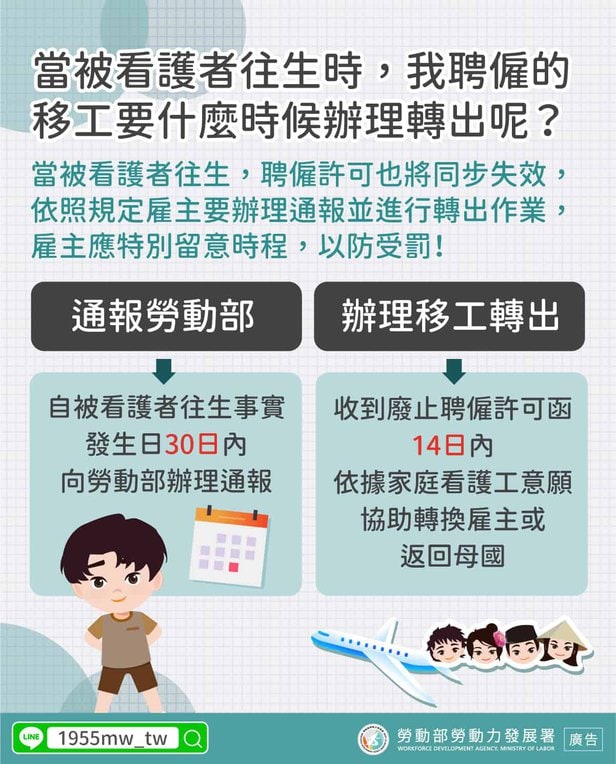 外籍看護|被照顧人往生後應注意事項 2023-10-31 作者: 21世紀人力仲介 媒體布小編 21世紀全球外勞集團協助您找到最適合的優質外籍勞工/家庭看護工/家庭幫傭 / 製造業移工/營造業移工/農業移工,如有服務需求請來電免付費專線(手機市話皆可撥) 0800-32-1111 或 留言給我們 上一頁上一篇外籍移工|旅宿業開放移工應做影響評估勞部二個月內完成 下一篇泰國移工|23 家臺灣仲介 泰國互貿 12 月將屆滿 服務員比例 1:50 英譯應與許可證相符下一篇 外籍幫傭|釋出婦女勞動力 賴總統提鬆綁外籍家庭幫傭 確保托育品質等前提下 洪申翰:正在評估中 2025-10-17 閱讀更多 » 畜牧移工|牧場主加強環境清潔 慎防類鼻疽菌 2025-10-20 閱讀更多 » 農業移工|失聯移工自組工班 侵害農民權益 立委籲充沛合法人力 農業部將爭取 2025-10-22 閱讀更多 » 相關