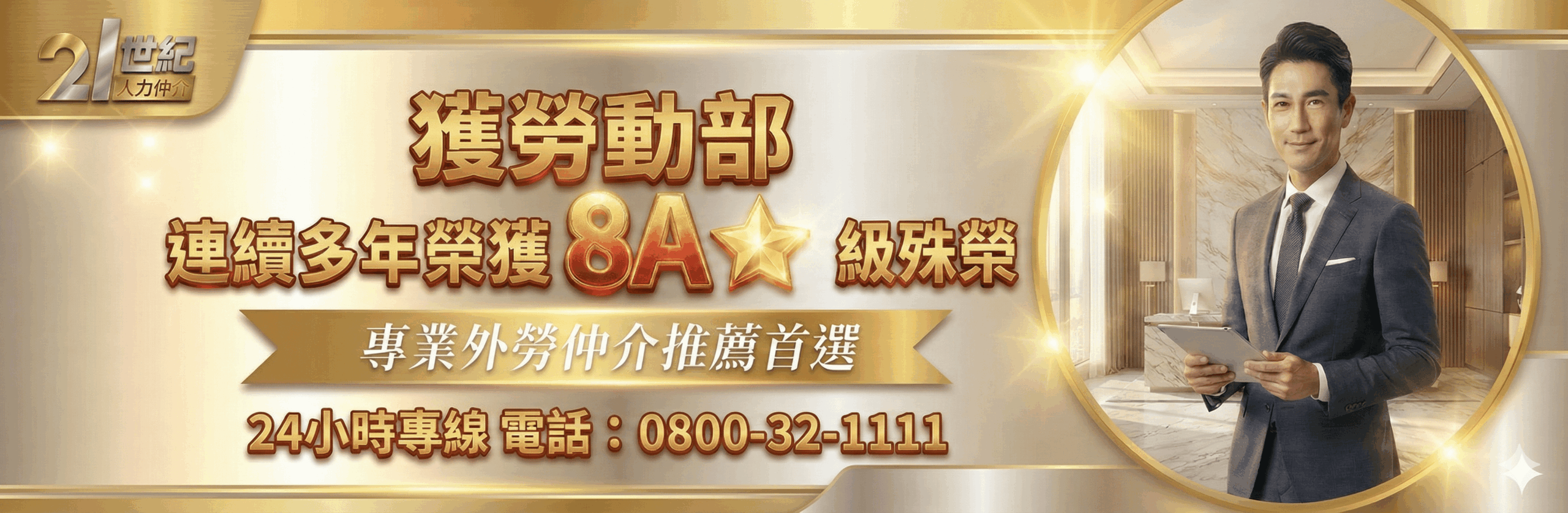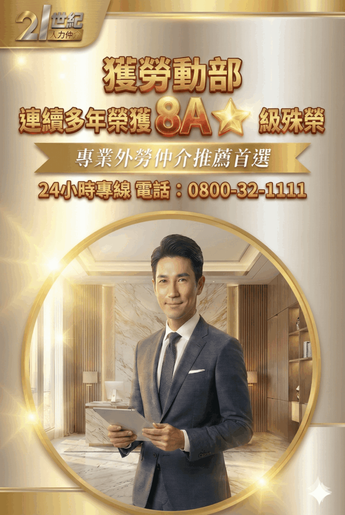 21世紀人力仲介深耕台灣多年,始終堅持「專業、誠信、責任」的企業精神。我們不僅符合政府 A 級評鑑標準,更自我要求達到「8A」級的極致服務品質。