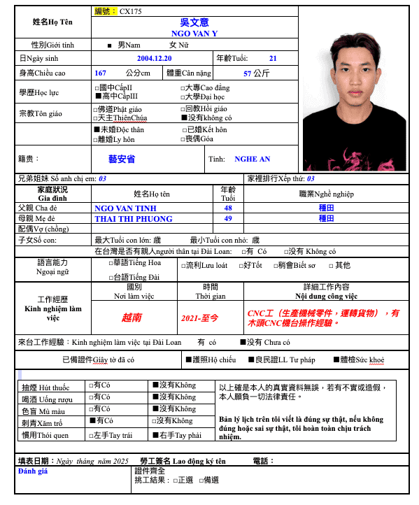 吳文意 NGO VAN Y 2025-07-17 作者: 21世紀人力仲介 温小編 其他監護工推薦 All 【可立即上工】產業類 辭氏映玲 TU THI ANH LINH 鄭文興 TRINH VAN HUNG 潘氏玄 PHAN THI HUYEN 潘青情 PHAN THANH TINH 查看更多 相關