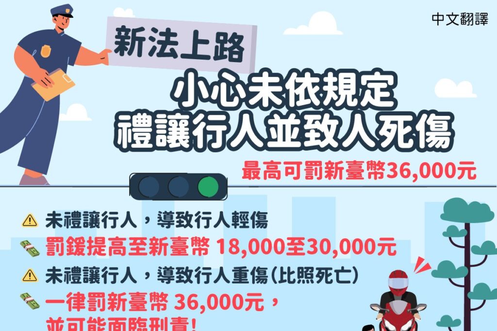 新法上路—小心未依規定禮讓行人並致人死傷 最高可罰新臺幣36,000元-多國語