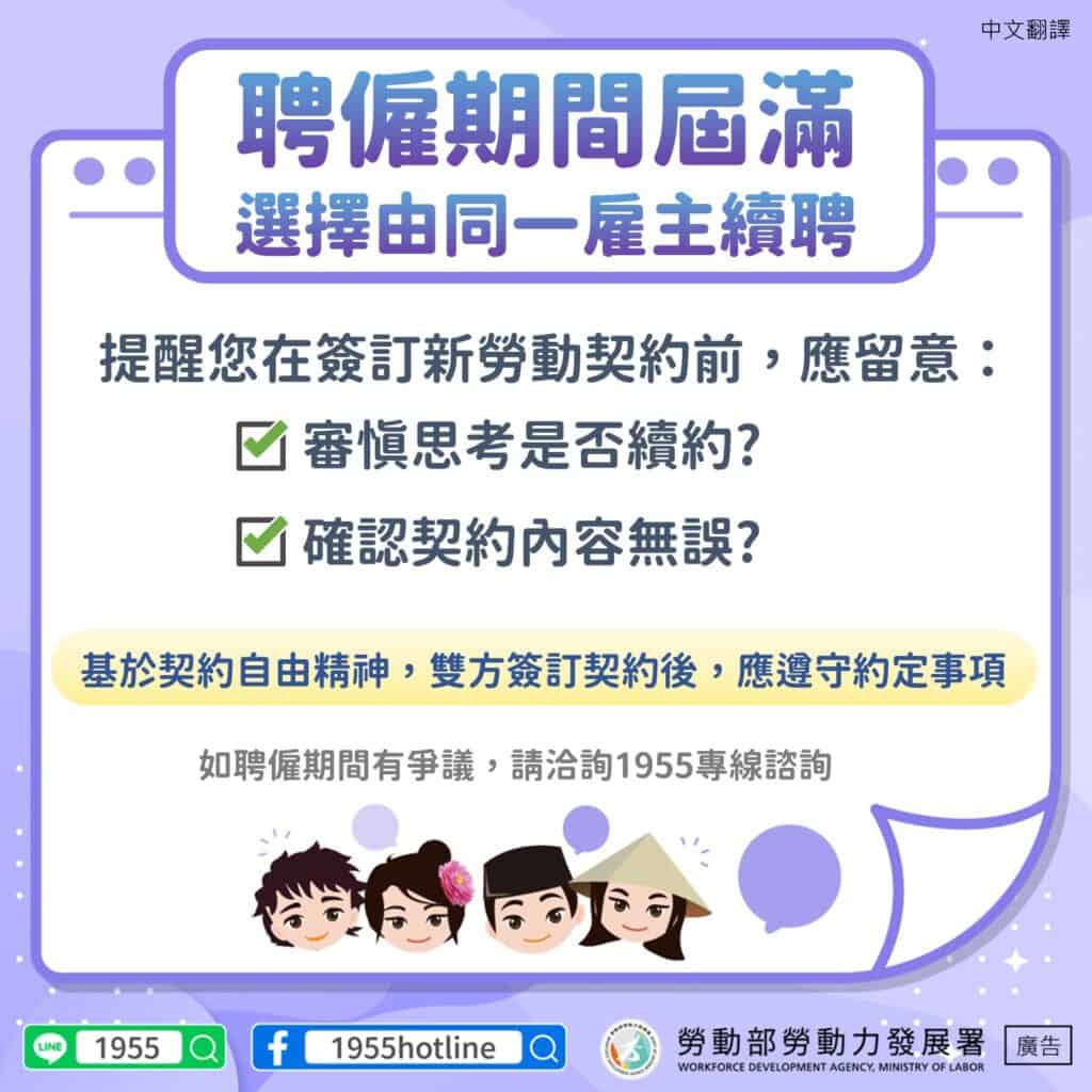 移工宣導|契約自由精神-聘僱期間屆滿選擇由同一雇主續聘應遵守約定事項-多國語言