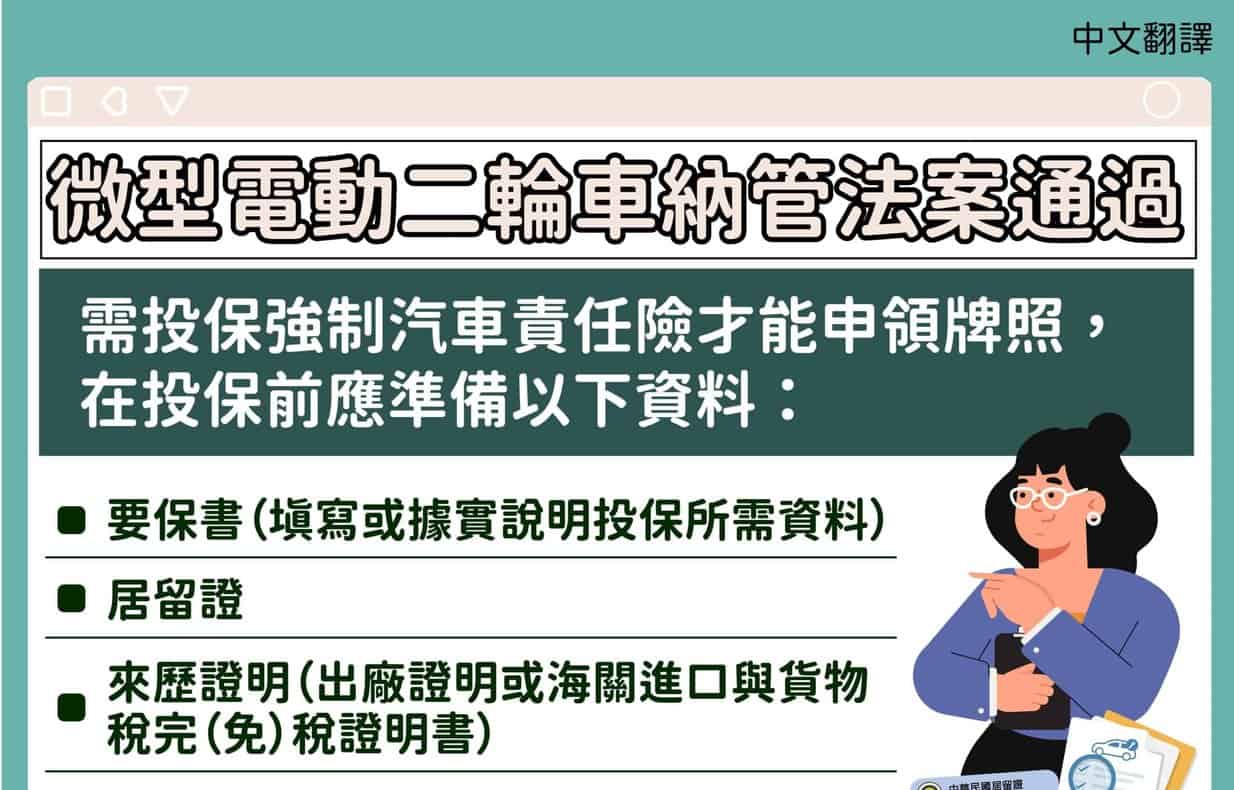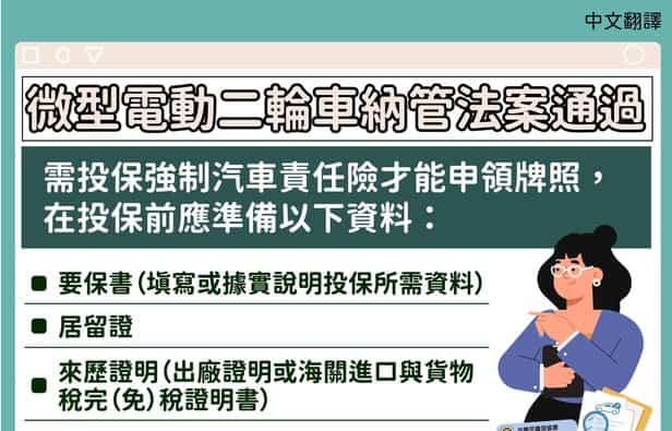 微型電動二輪車 如何投保強制汽車責任險-多國語言