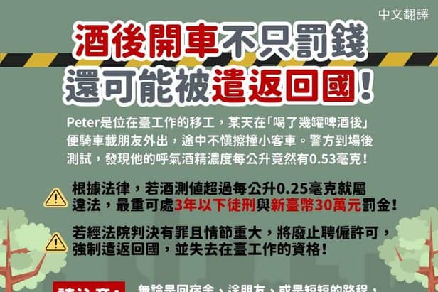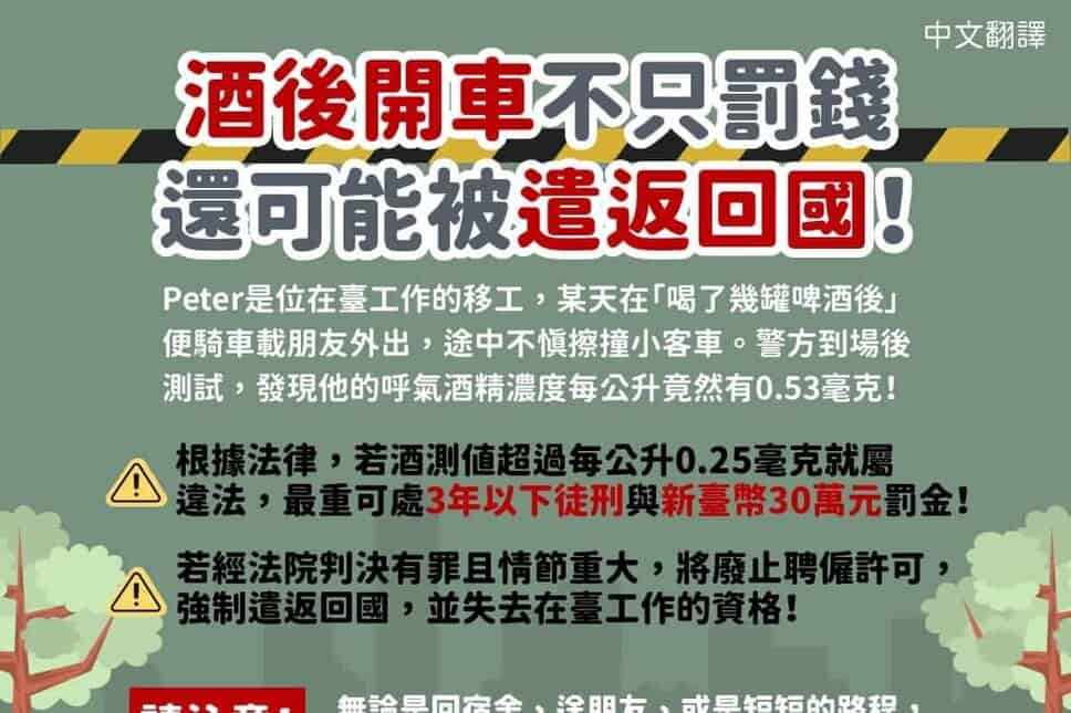 移工宣導|酒後開車不只罰錢,還可能被遣返回國!(交通)-多國語